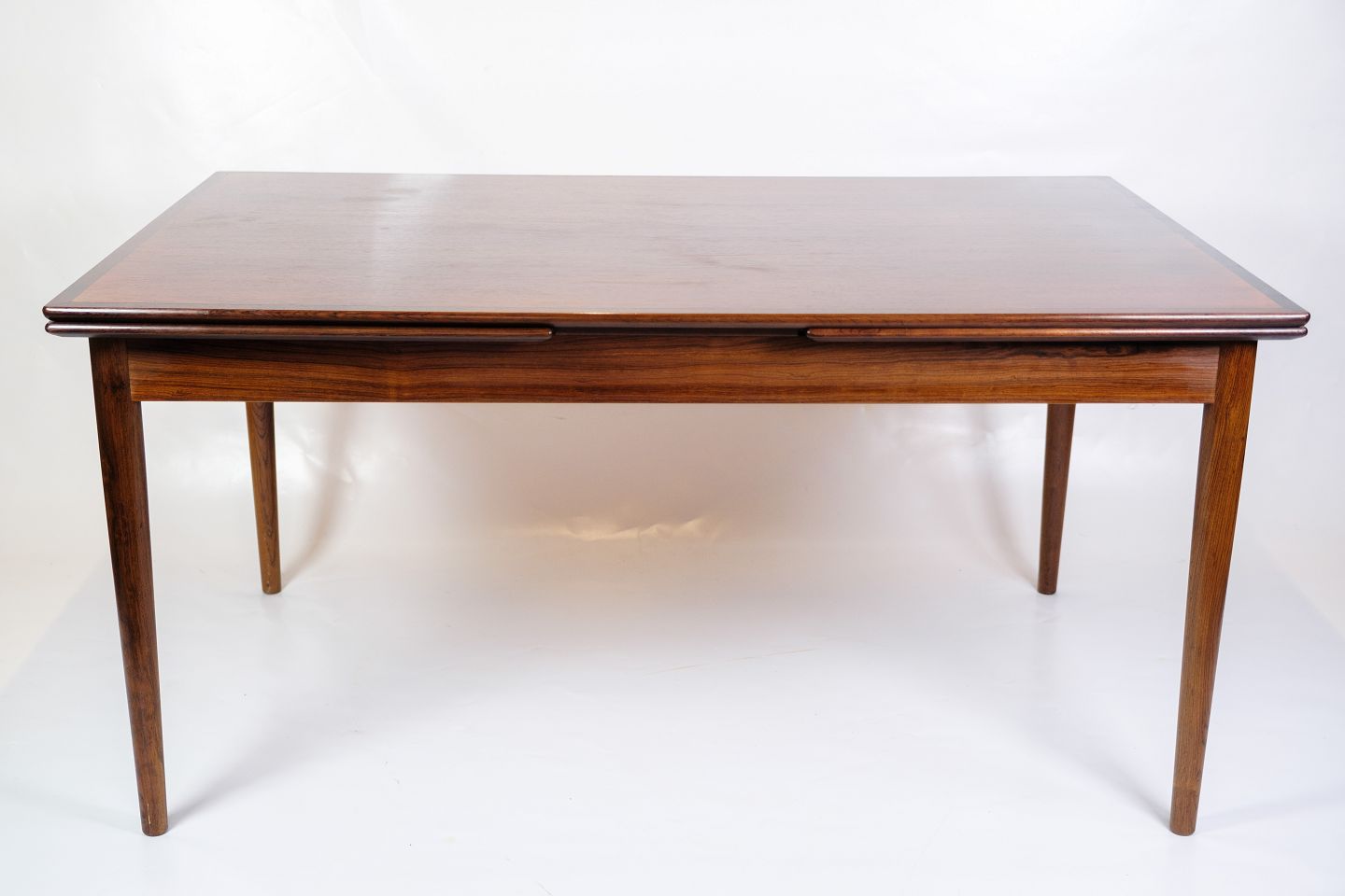 Stort spisebord fra 1960'erne, udført i palisander med to udtræksplader. Bordet fremstår i meget pæn stand, og de praktiske udtræksplader giver mulighed for at udvide bordpladsen ved behov. Det smukke palisandertræ tilføjer en elegant og tidløs æstetik, der passer ind i mange typer af indretninger.