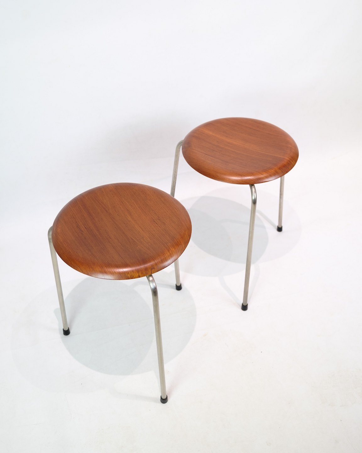 SoldSet of 2 Dot stools, model 3170, designed by Arne Jacobsen and produced by Fritz Hansen in the 1950s. The stools are made of teak, which gives them a warm and classic look. The Dot stool is an example of Jacobsen's minimalist and functional design style.