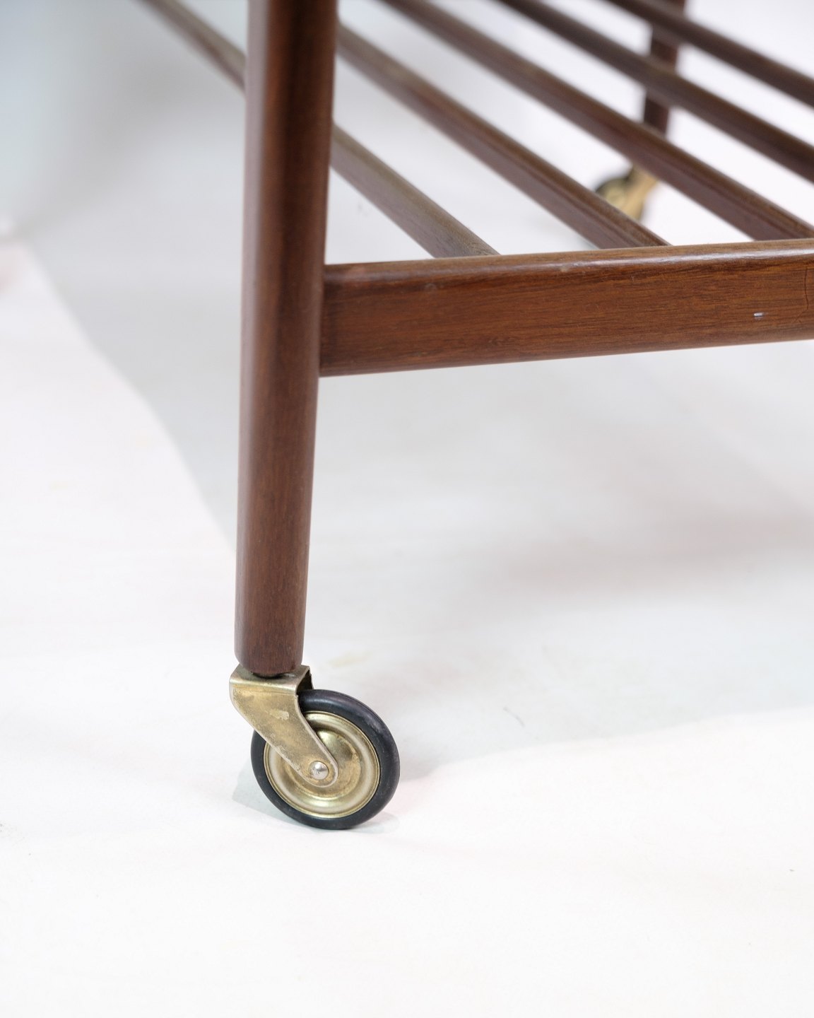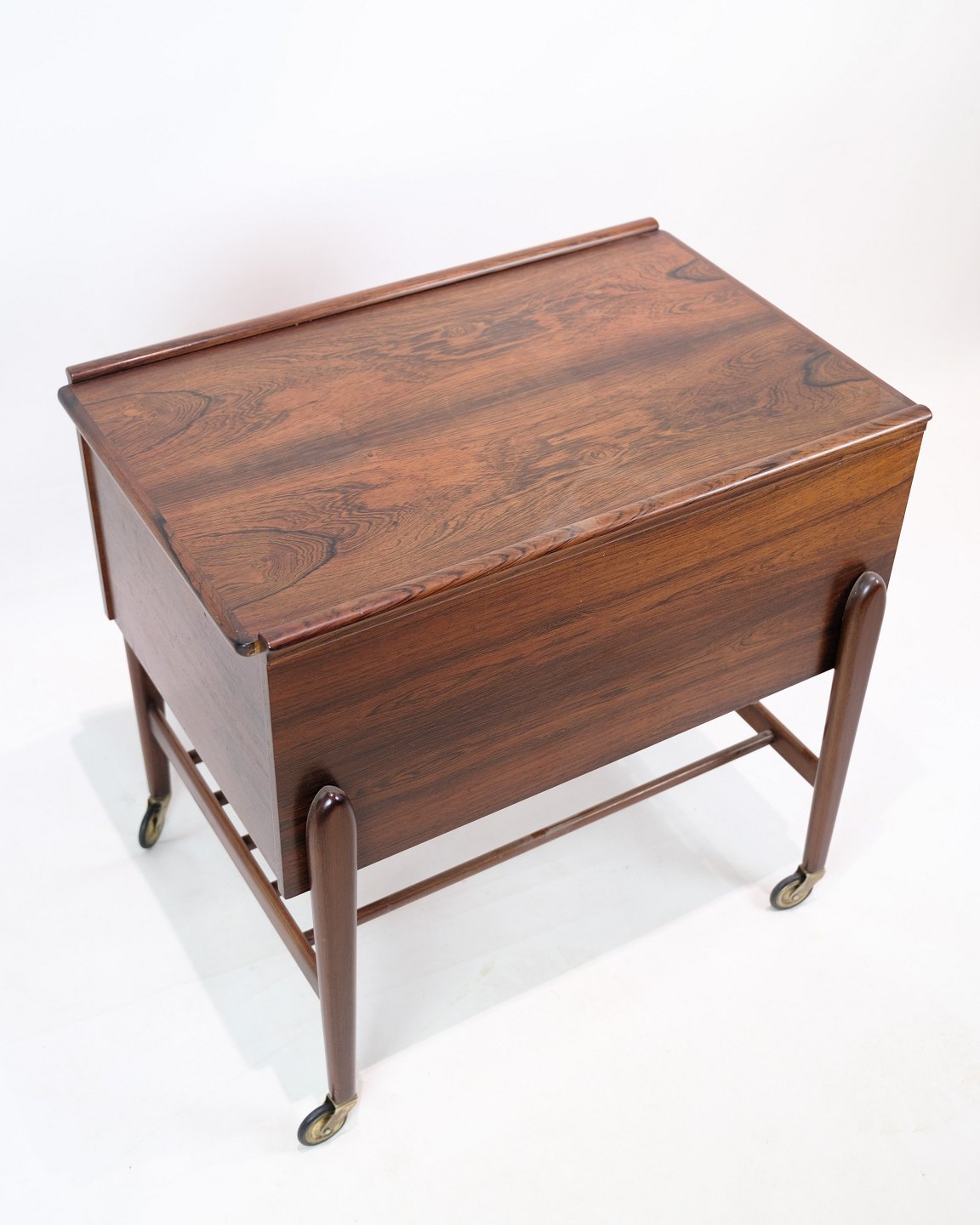 SoldSewing table with wheels in rosewood from the 1960s. The table has a practical built-in drawer for storing sewing accessories and is made of materials that ensure good durability. The wheels make the table easy to move around, increasing its functionality. The rosewood is known for its durability, making the table a solid choice for long-term use.