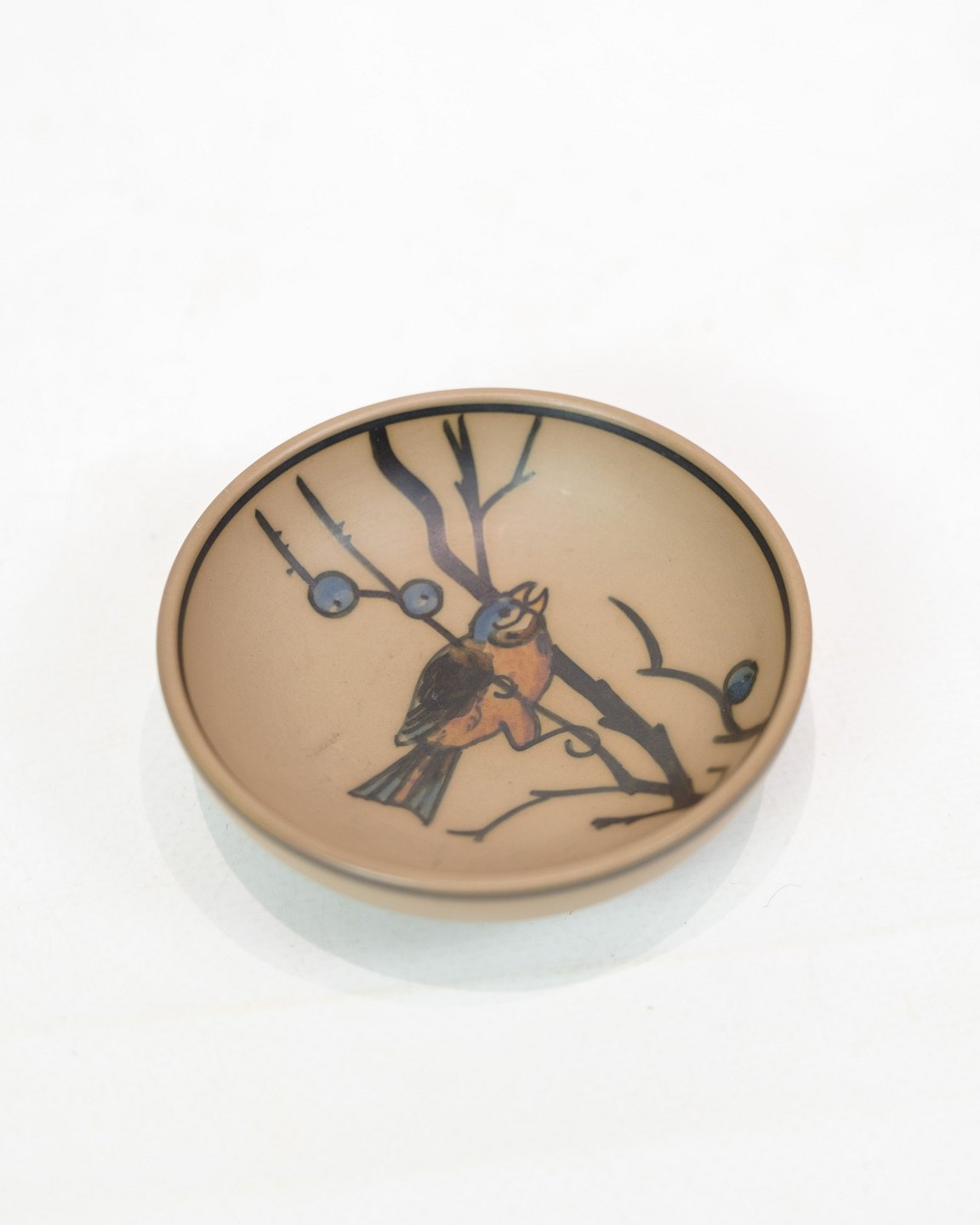 Keramikskål med motiv af en fugl, fremstillet af Hjorth Keramik i 1960'erne. Hjorth Keramik er kendt for sit håndværk og dekorative keramiske værker, der ofte afspejler naturmotiver som fugle.
