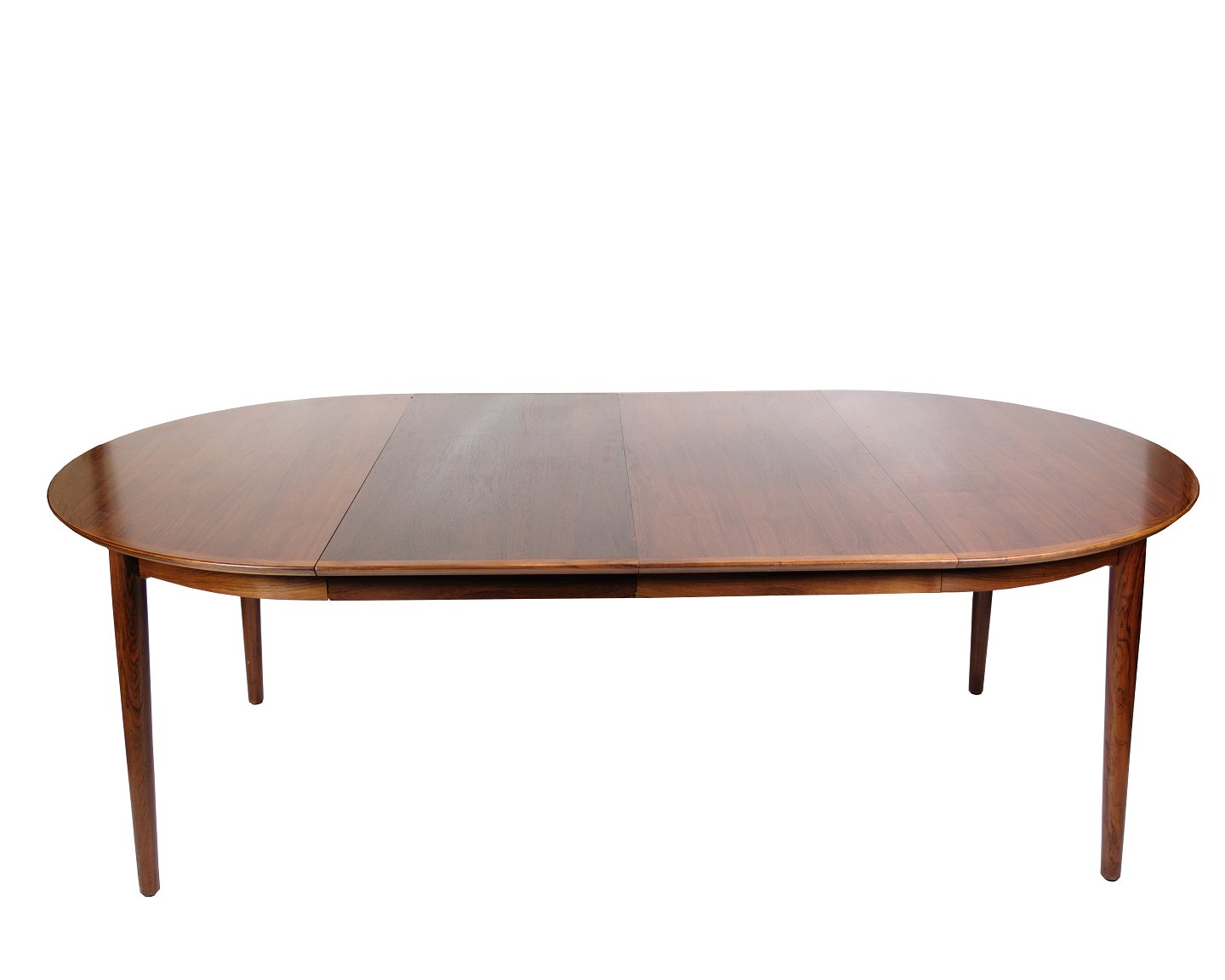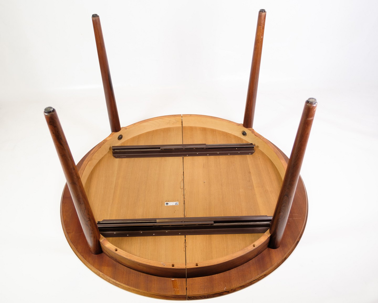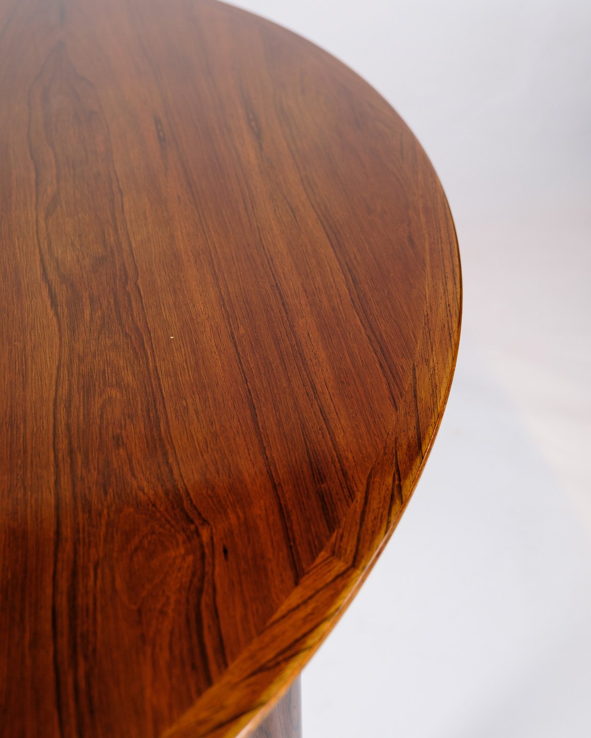 SolgtRundt spisebord i Palisander med tillægsplader, designet af Arne Vodder og fremstillet af Sibast Møbler i 1960'erne. Bordet kombinerer funktion og kvalitet, med en robust konstruktion i teak, der giver det en varm og naturlig glød. Tillægspladerne gør det muligt at udvide bordet, så det kan rumme flere gæster.