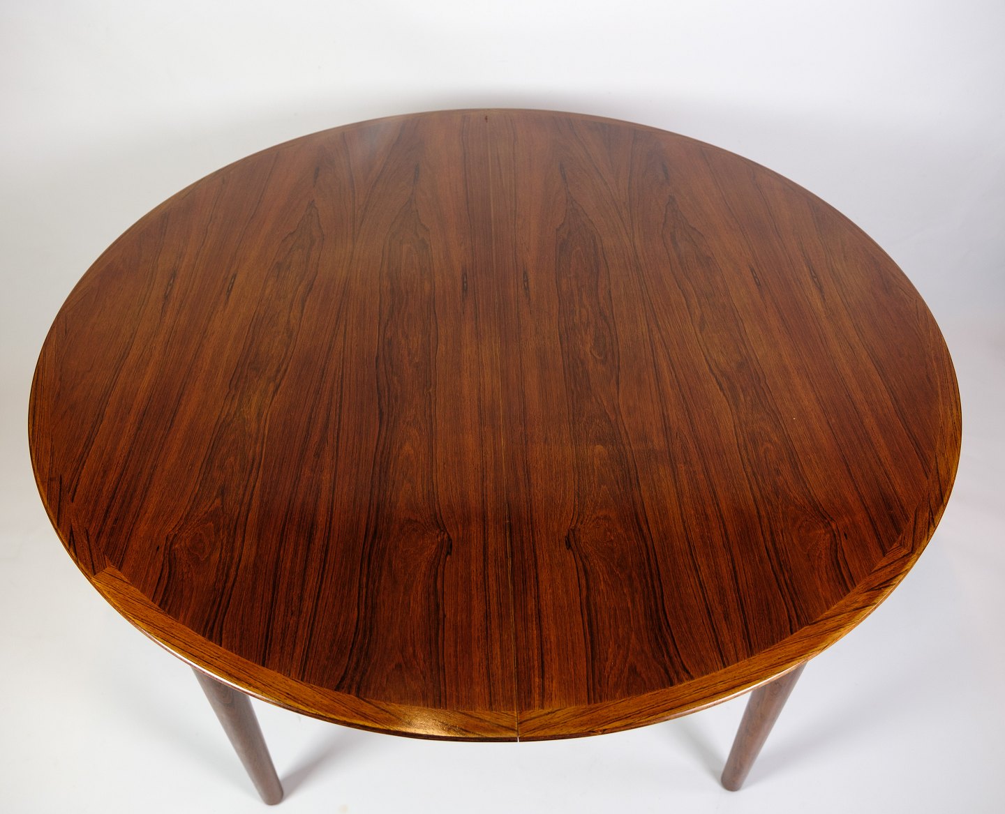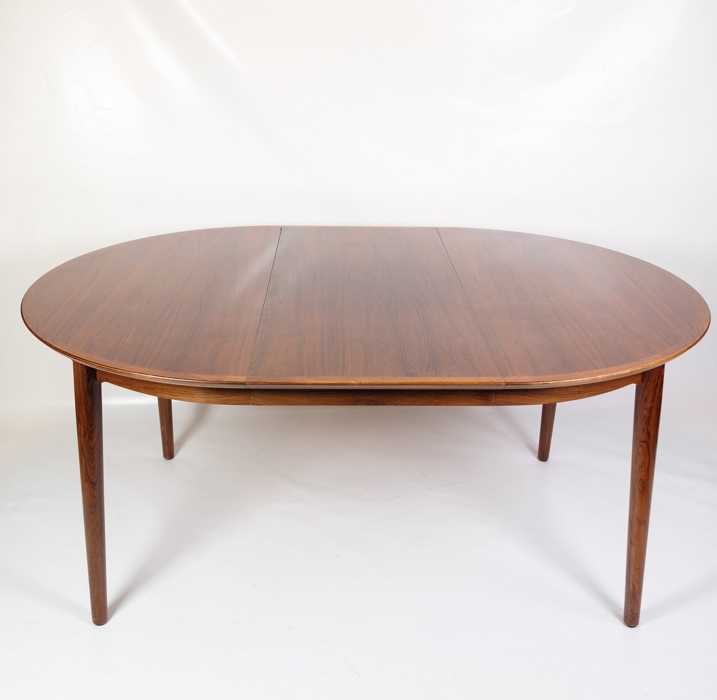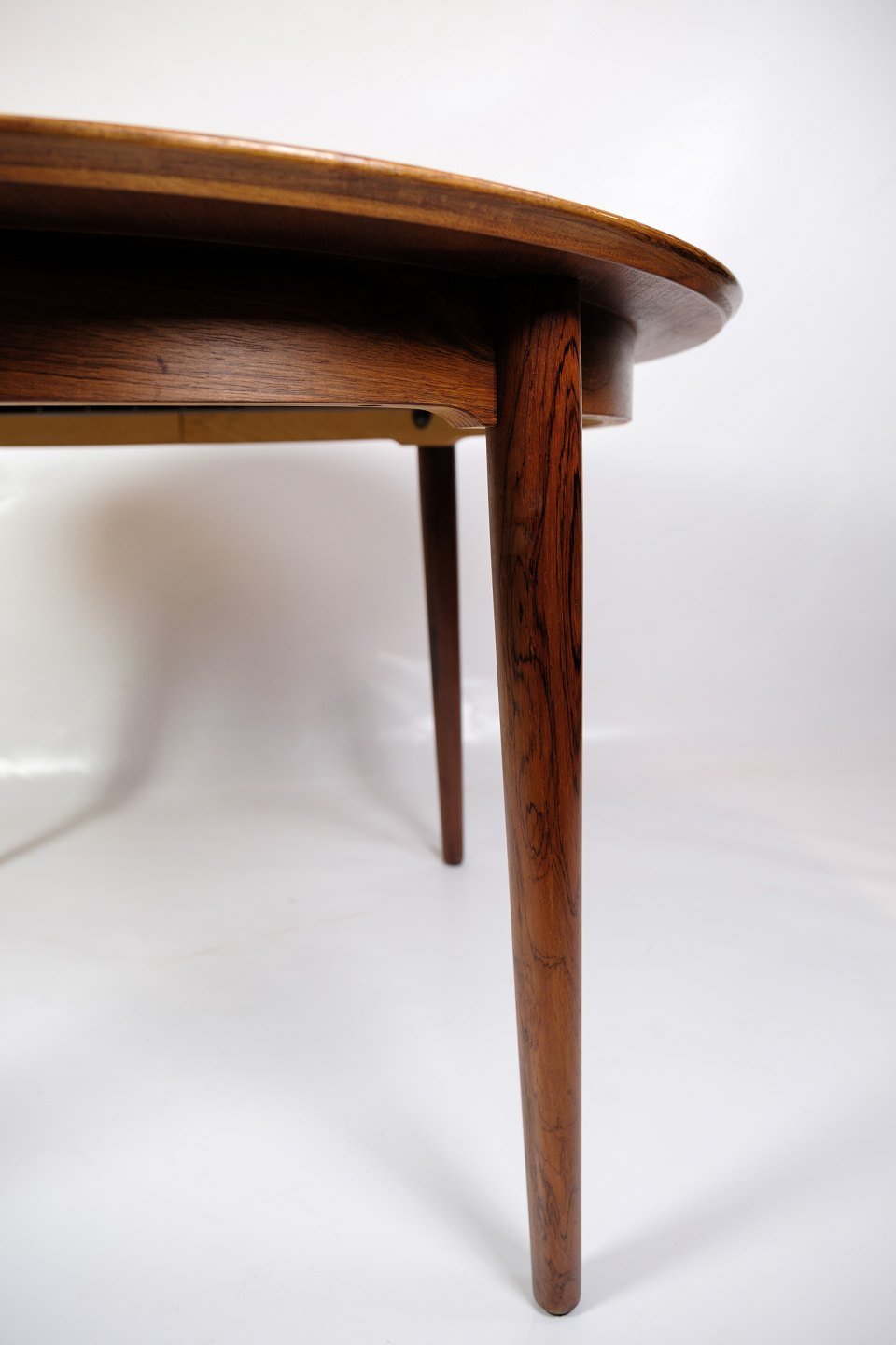 SolgtRundt spisebord i Palisander med tillægsplader, designet af Arne Vodder og fremstillet af Sibast Møbler i 1960'erne. Bordet kombinerer funktion og kvalitet, med en robust konstruktion i teak, der giver det en varm og naturlig glød. Tillægspladerne gør det muligt at udvide bordet, så det kan rumme flere gæster.