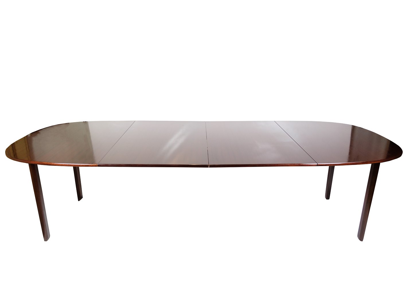 Dining table in mahogany, designed by Ole Wanscher and produced by P. Jeppesen in the 1960s. The table is made of solid mahogany, which gives it an elegant and classic appearance. Ole Wanscher was known for his refined design and his focus on quality craftsmanship.