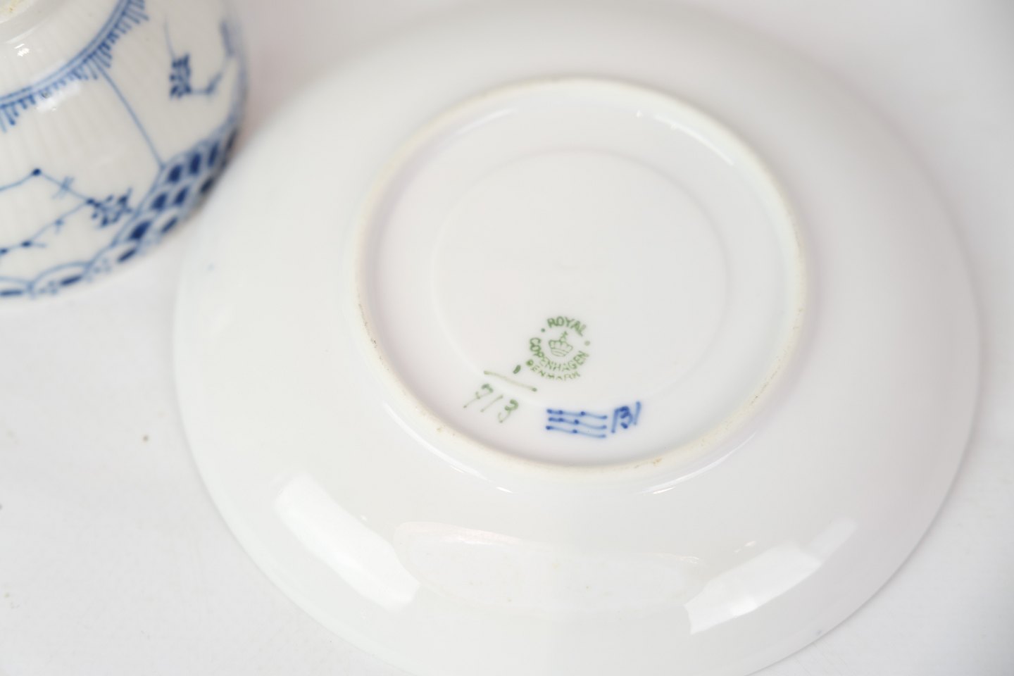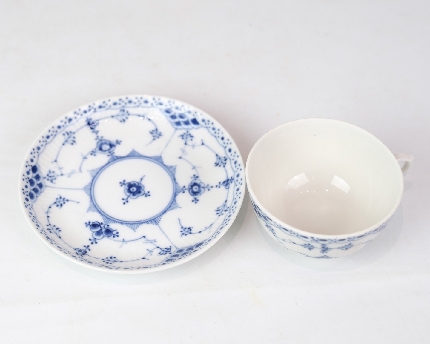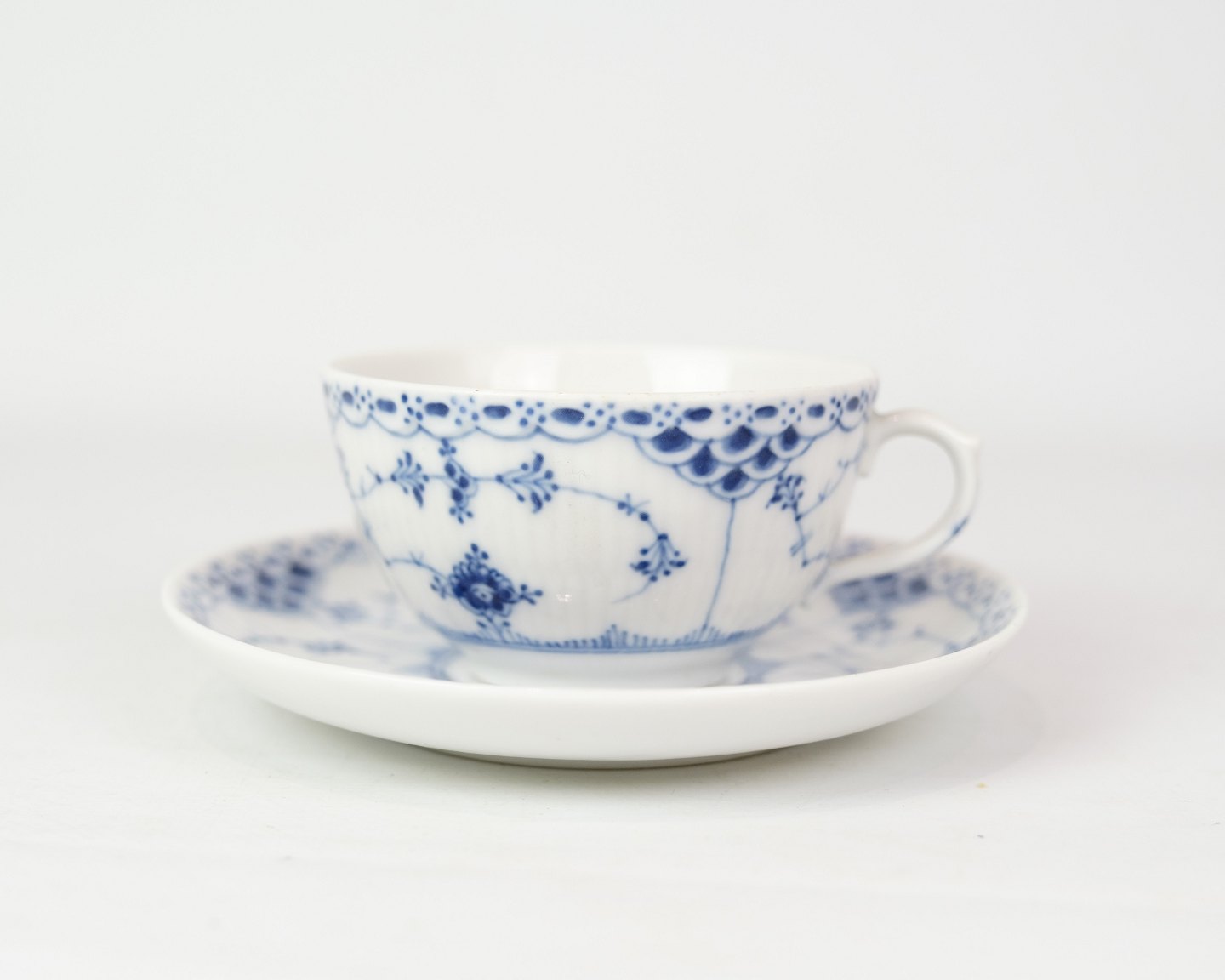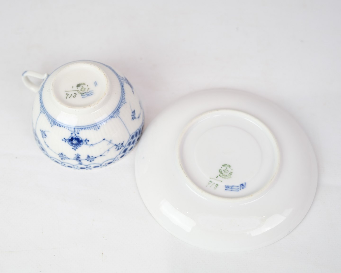 Tekop med underkop mærket nr. 1/713 fra Royal Copenhagen. 1. Sortering i halvblonde musselmalet design. Designet af Arnold Krog.