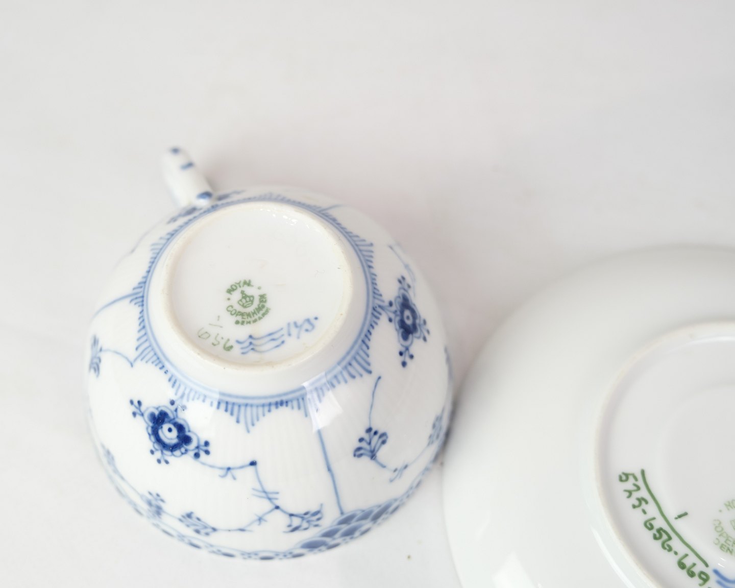 Teacup with saucer of patterned blue fluting half lace model no. 656 with matching saucer.