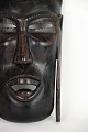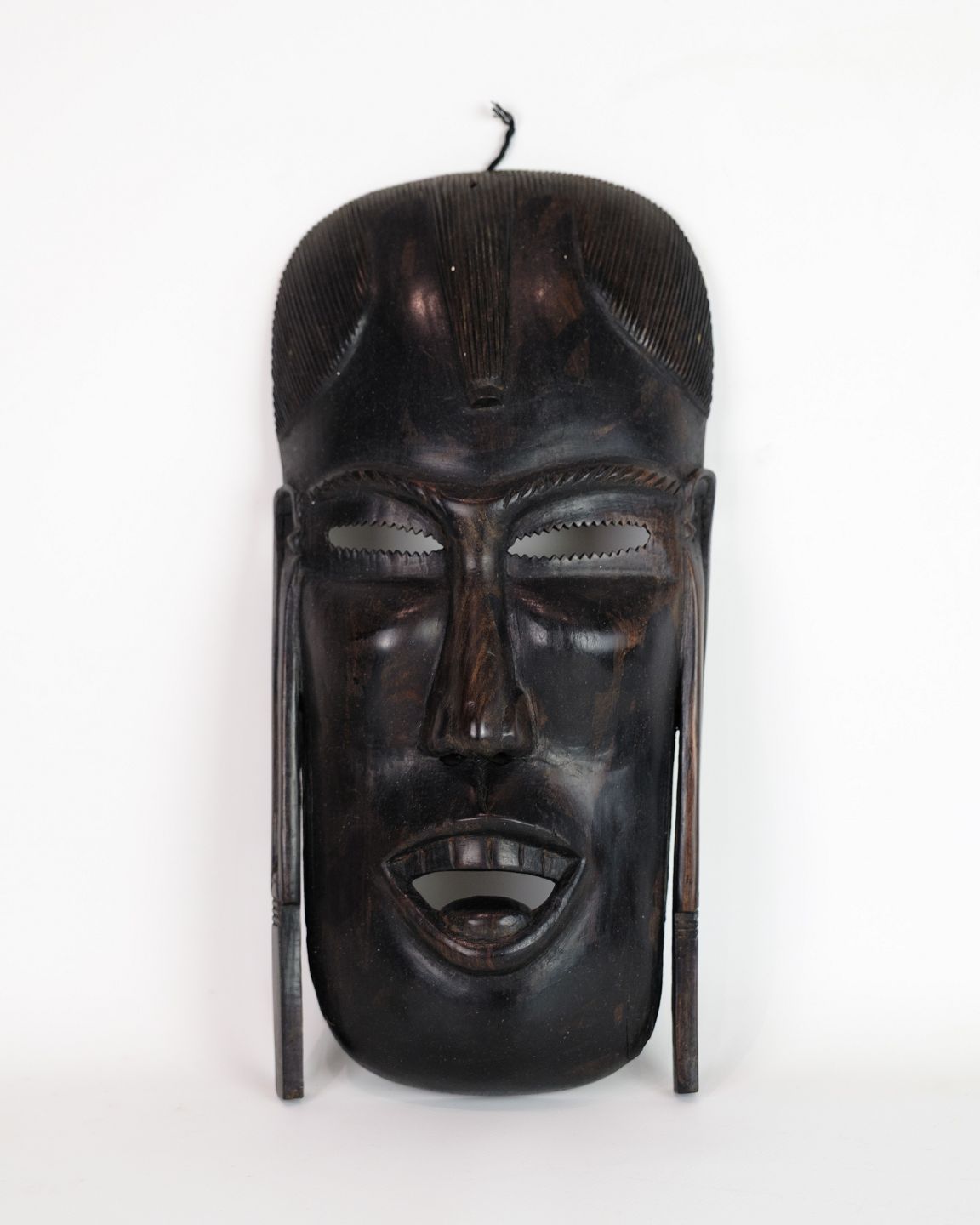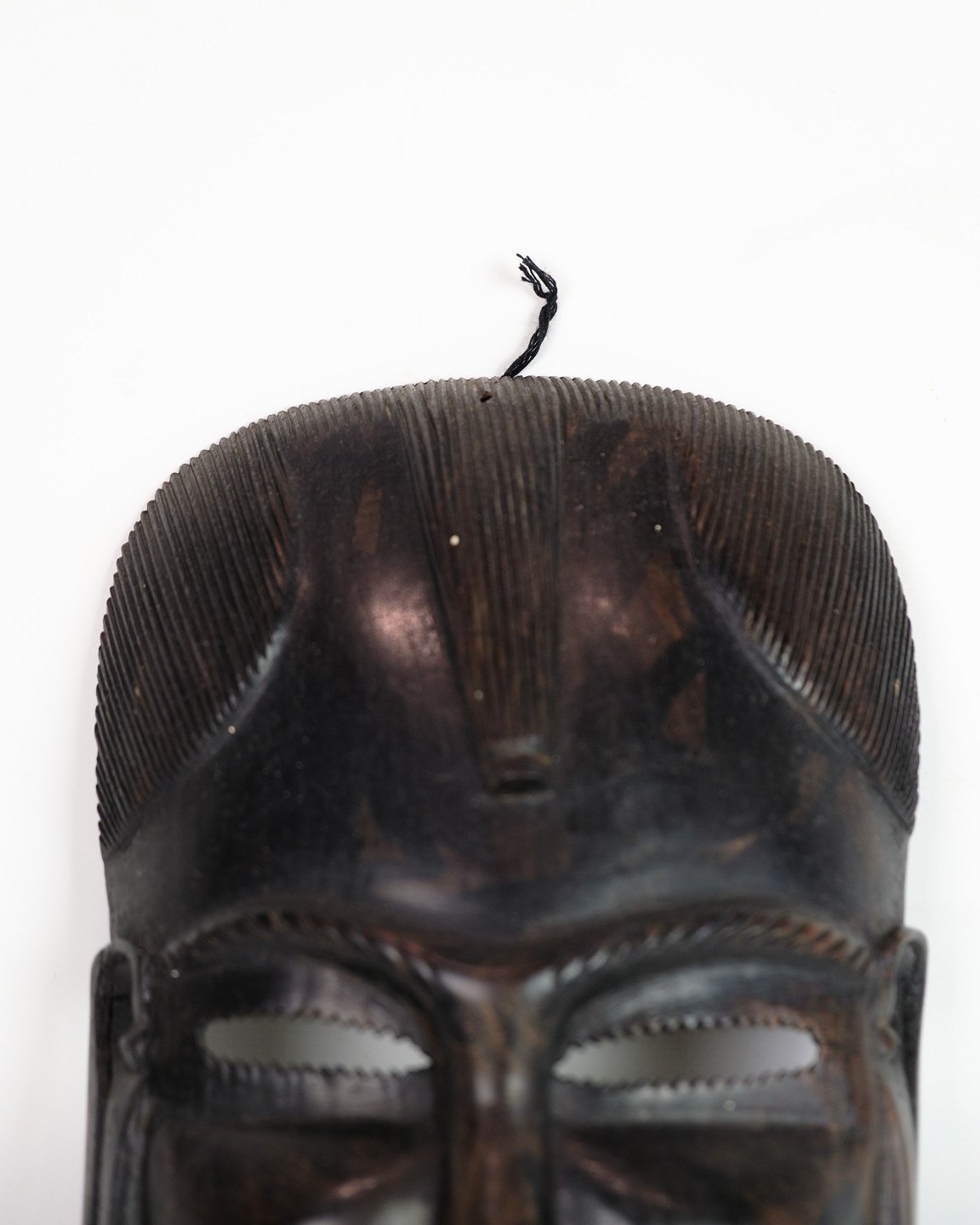 African mask, hand-carved in dark wood, typical of traditional ceremonies and rituals in West and Central Africa. The mask often represents spirits or ancestors and is an authentic example of African craftsmanship.
