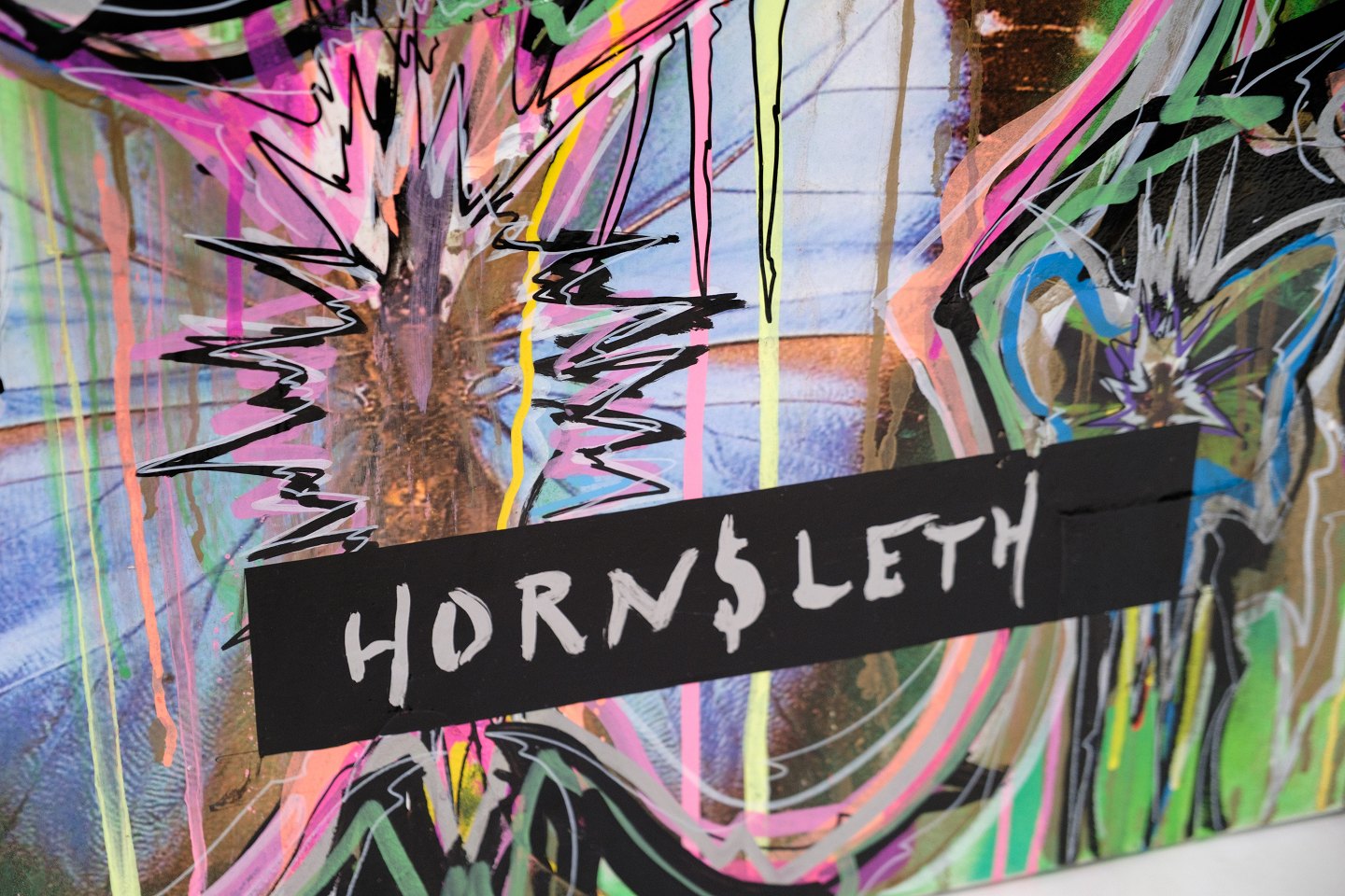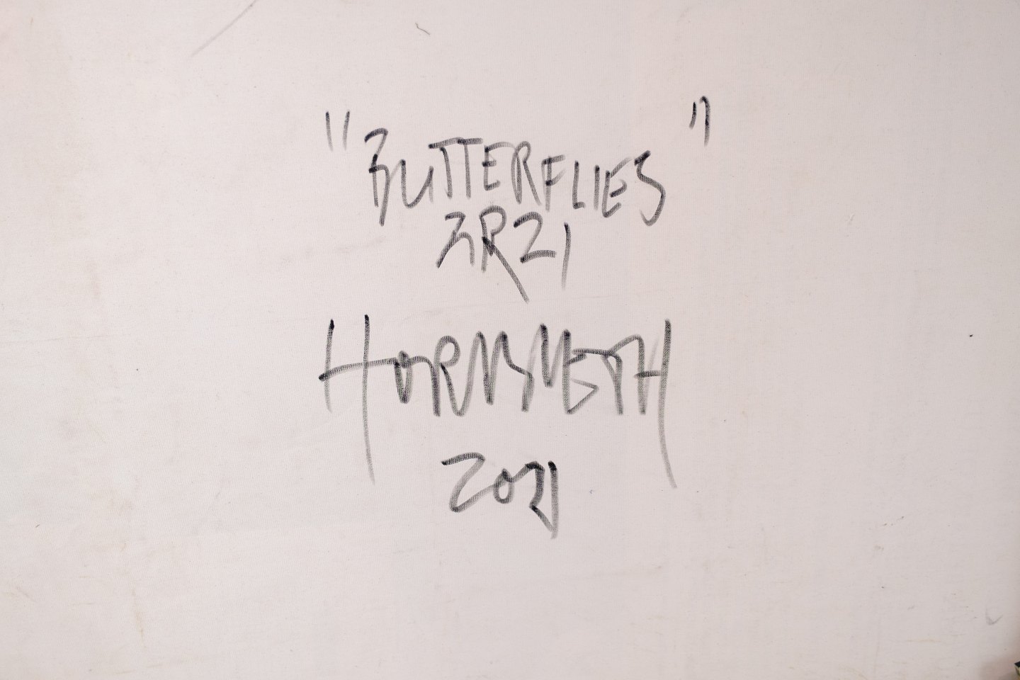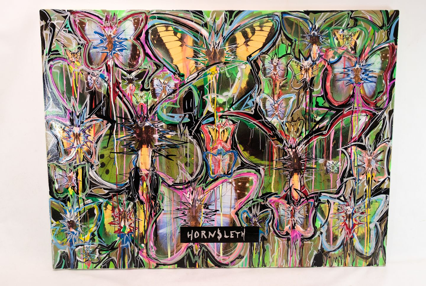 Please contact us for price informationOriginal painting by Kristian von Hornsleth in mixed media on canvas from 2021 titled "Butterflies ART". The painting measures approx. 106 x 140 cm and is a characteristic example of Hornsleth's colorful and energetic style. The work is dominated by butterfly motifs in layers upon layers of strong brushstrokes, drips and contrasting colors, with the iconic "HORNSLETH" name centrally placed.