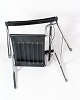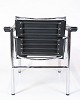 A pair of classic armchairs in black full grain leather with chrome frames. Model LC1 was designed in 1928 by Le Corbusier. The backrest of the chair is adjustable. They are in very good condition in both chrome and leather.