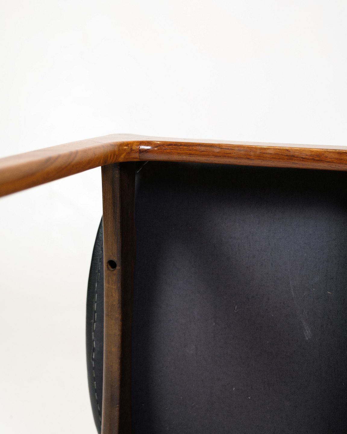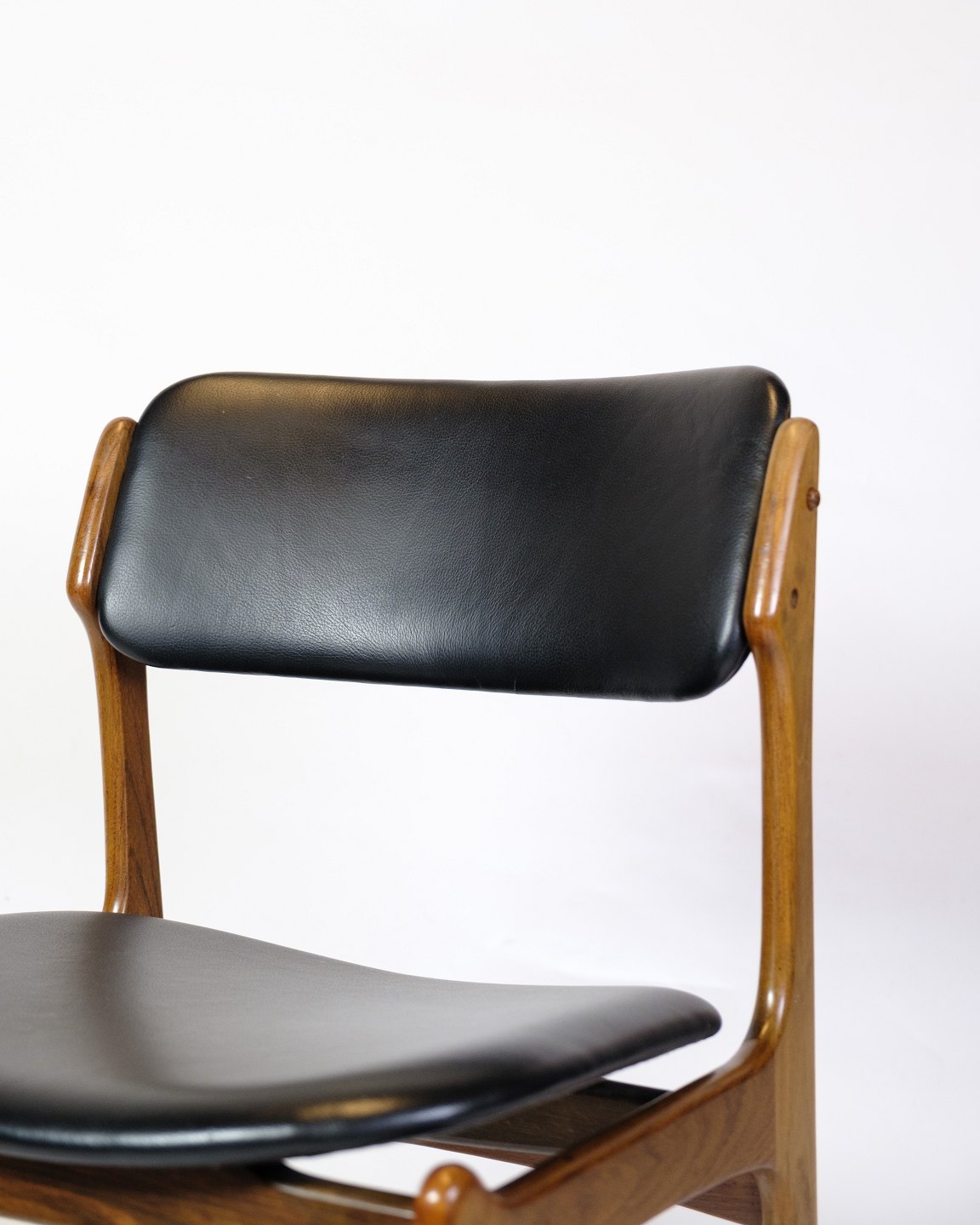 Set of four dining chairs, model OD49, designed by Erik Buch and manufactured by O.D. Møbler in the 1950s. The chairs are made of rosewood with seats upholstered in black leather. Model OD49 is known for its floating seat and soft organic lines, which provide high comfort and a light, elegant expression.