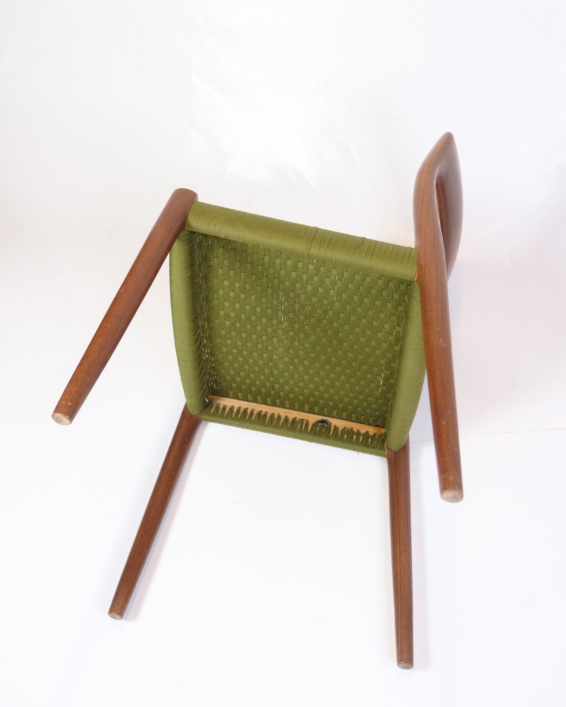 SoldSix dining chairs designed by Niels O. Møller in the 1960s. Model 77 is made of teak with seats in green paper wicker. The chair's simple lines and curved backrest provide good seating comfort and a clear design language that has made Møller's design a permanent part of Danish furniture history. A solid choice for both classic and modern interiors.