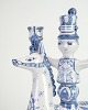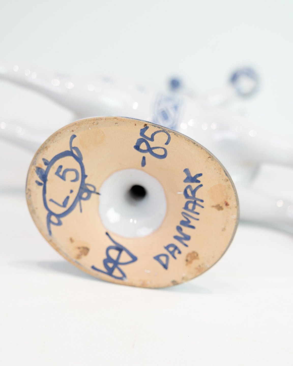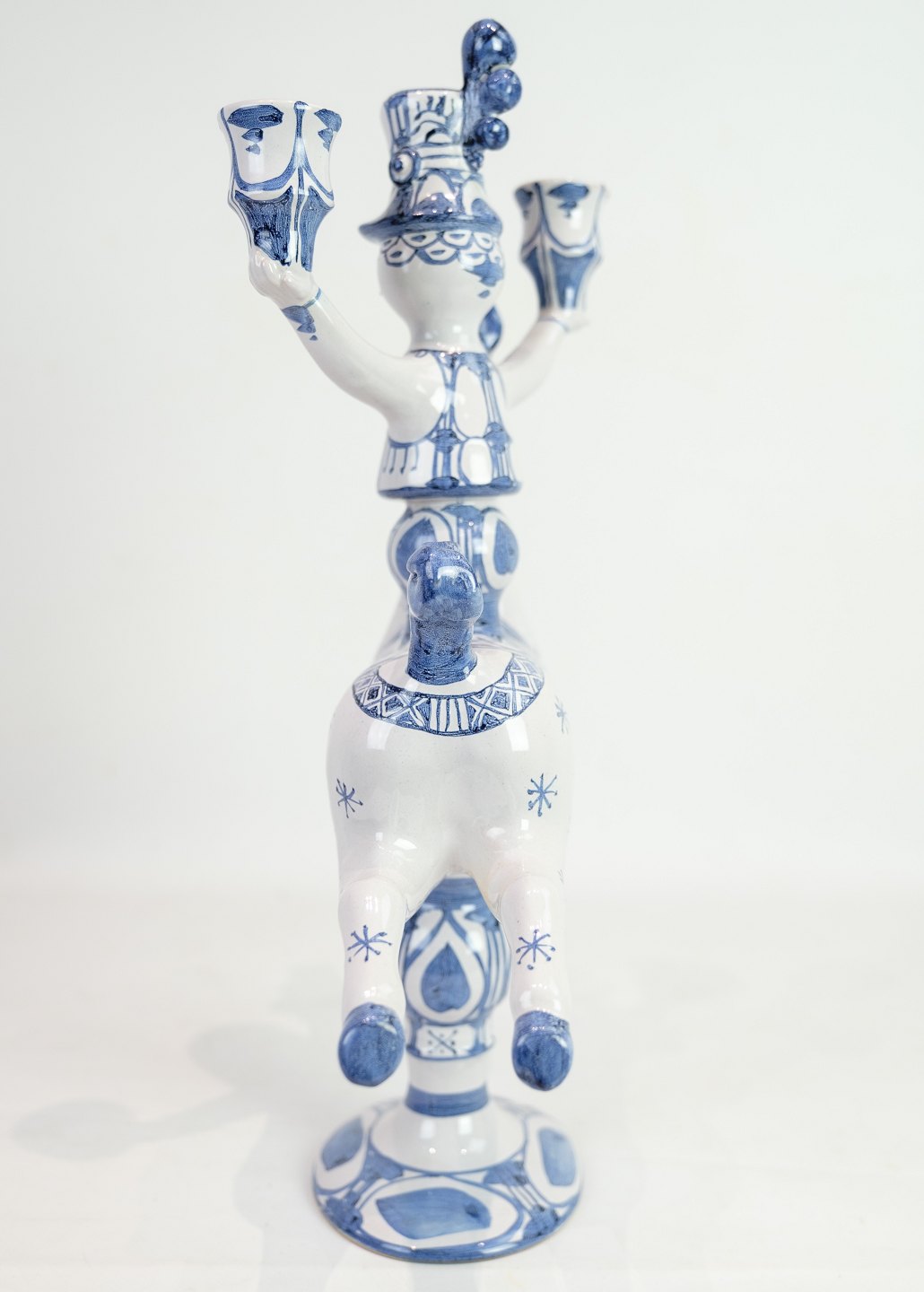 Bjørn Wiinblad equestrian candlestick in glazed earthenware from 1985. Signed, decorated in blue and white. A figurative classic with three candle holders.