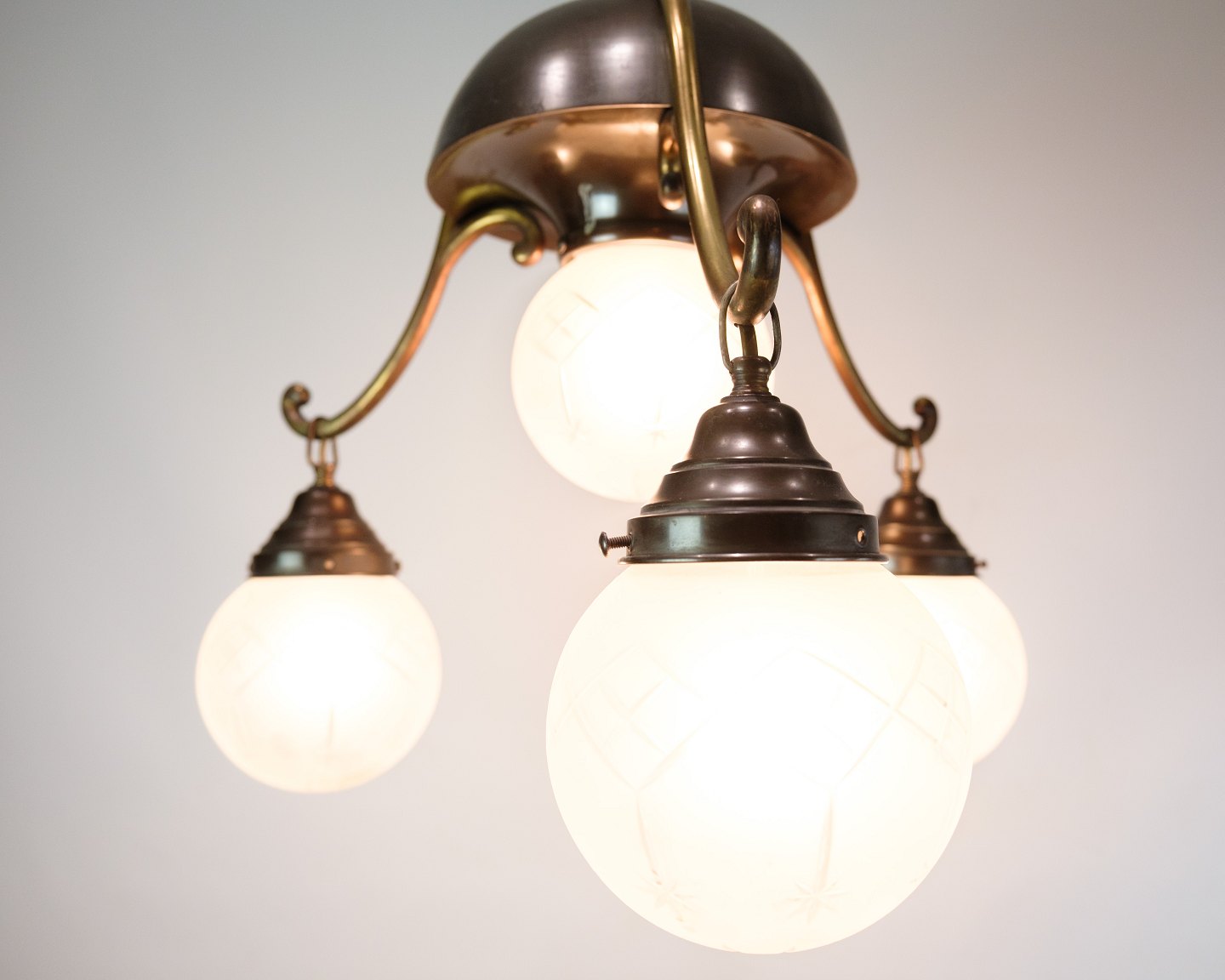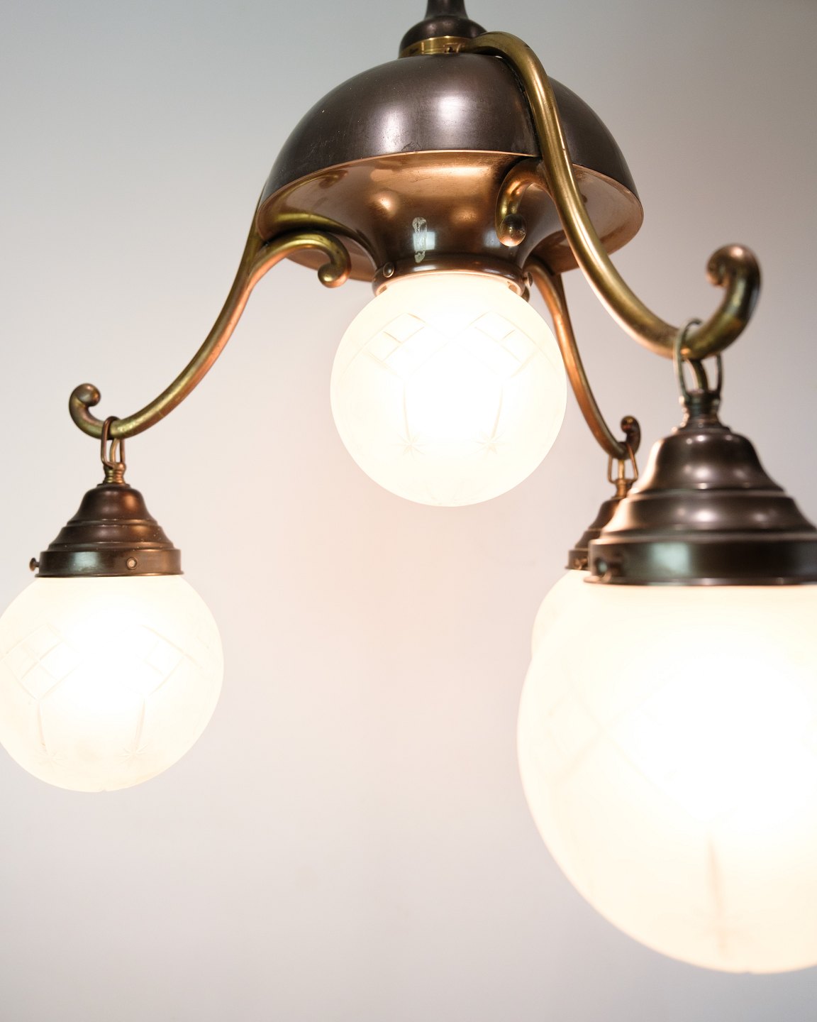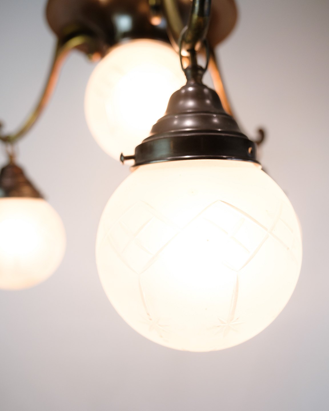 3-armet Lysekrone - Bruneret Messing & Opalglas Kugler – JugendStil - 1930’erne
