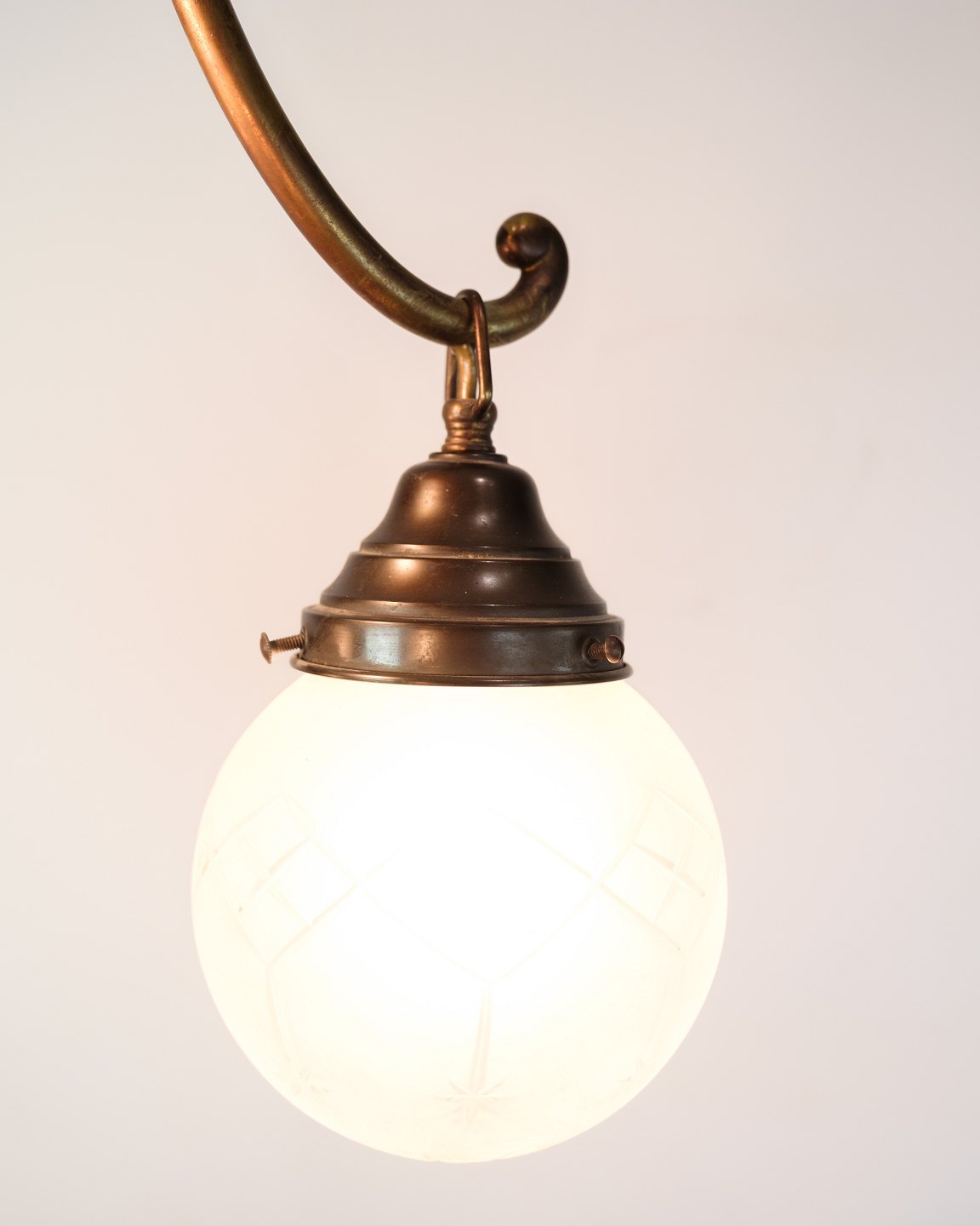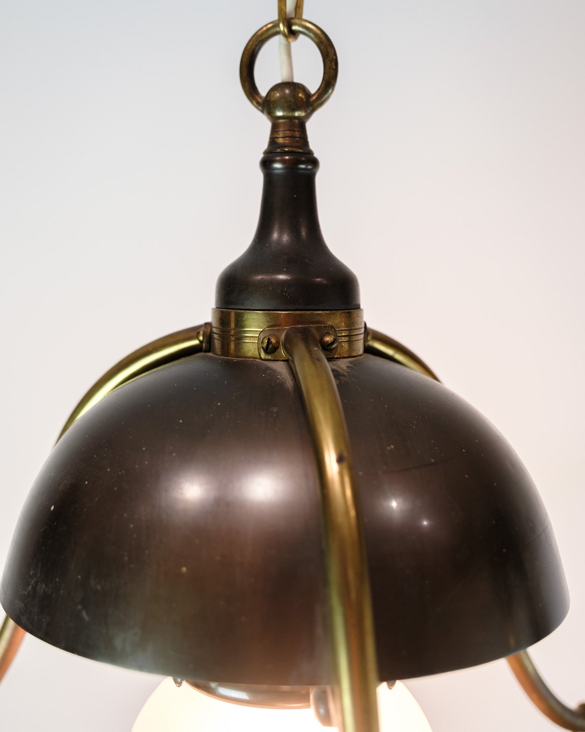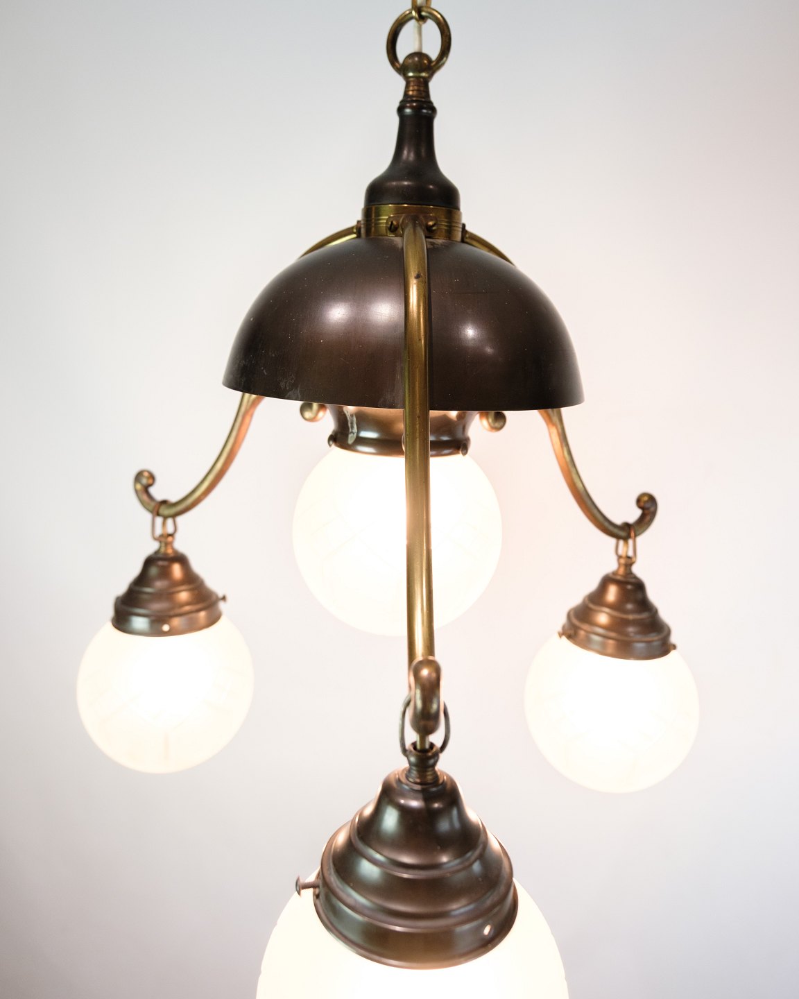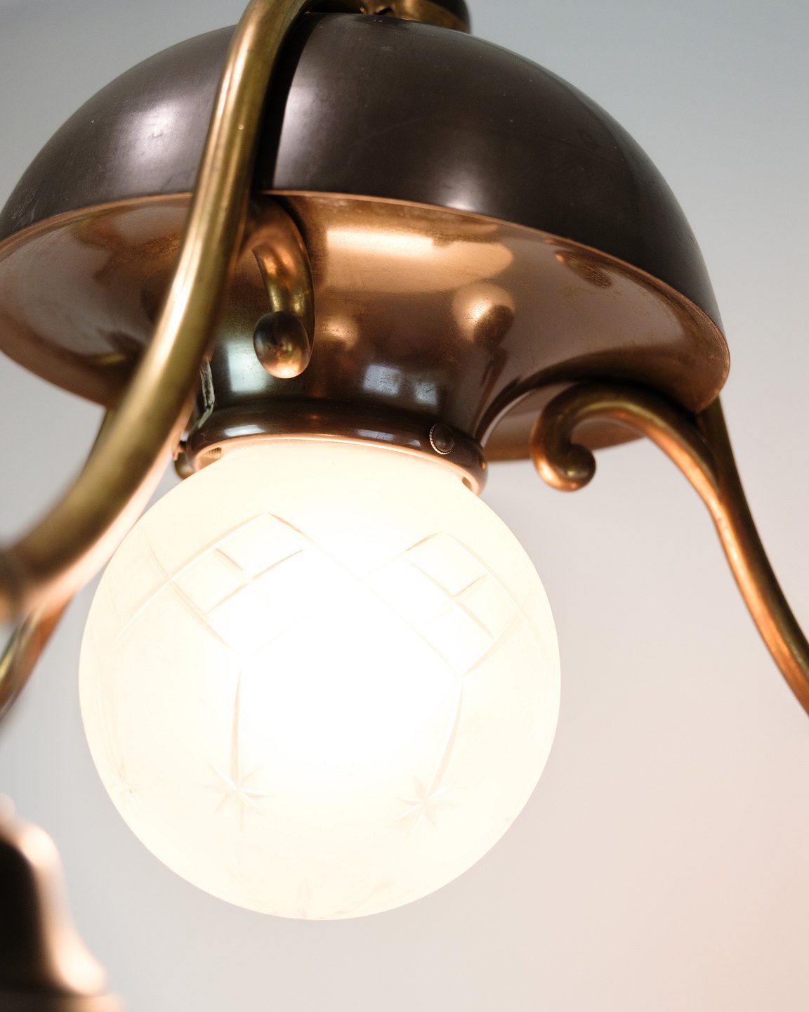 3-armet Lysekrone - Bruneret Messing & Opalglas Kugler – JugendStil - 1930’erne