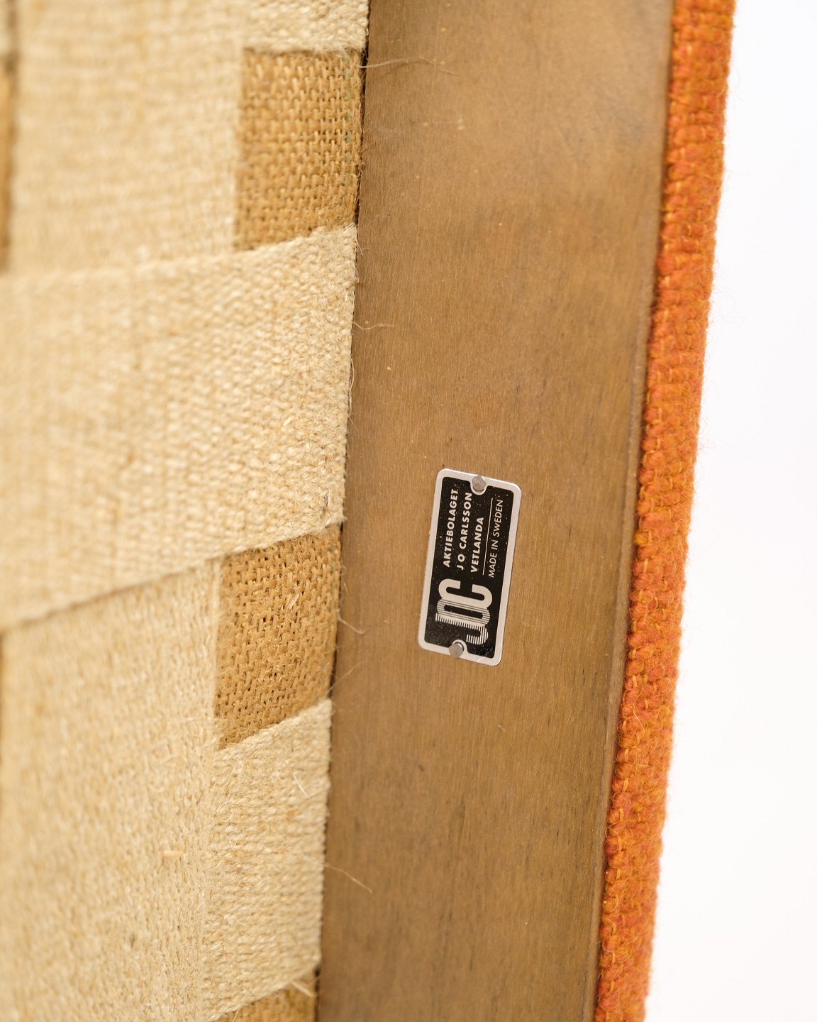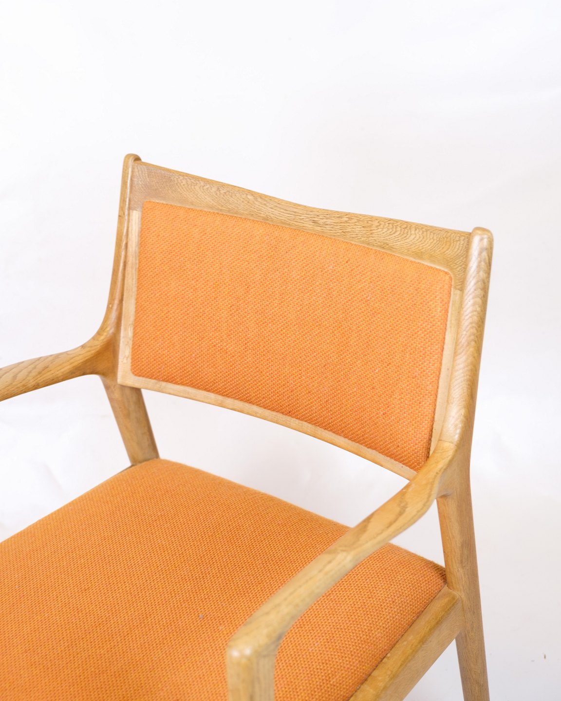 Armchair designed by Karl Erik Ekselius and produced by JOC Vetlanda in Sweden in the 1960s. The chair is made of solid oak with a light, shaped frame and fine details. The seat and back are upholstered in orange fabric.