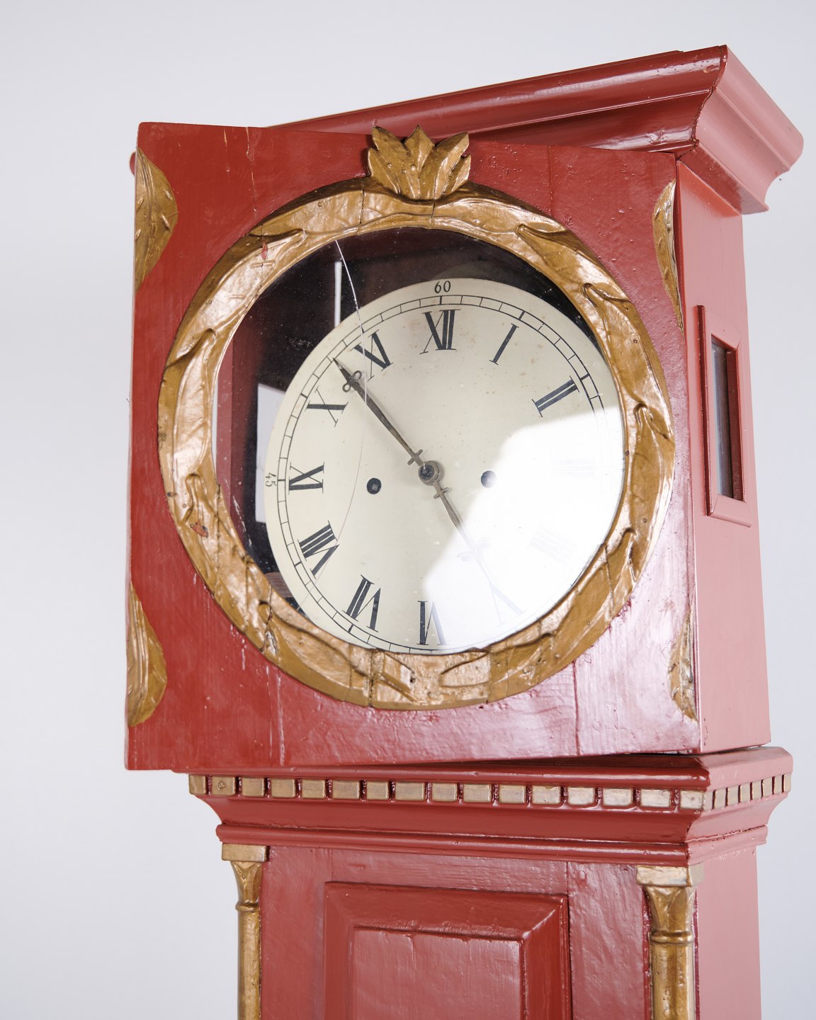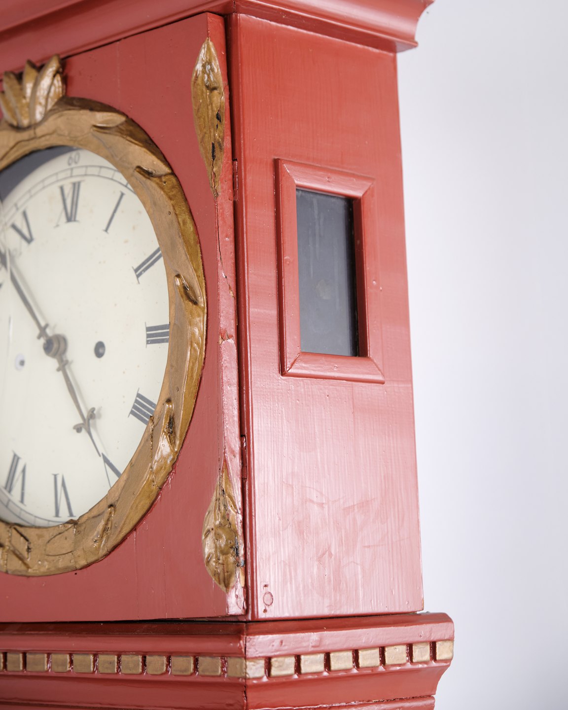 Bornholmerur fra ca. 1820’erne, rød­bemalet med dekorative udskæringer og klassisk formsprog fra perioden. Et originalt standerur med karakter og tidsrigtige detaljer.