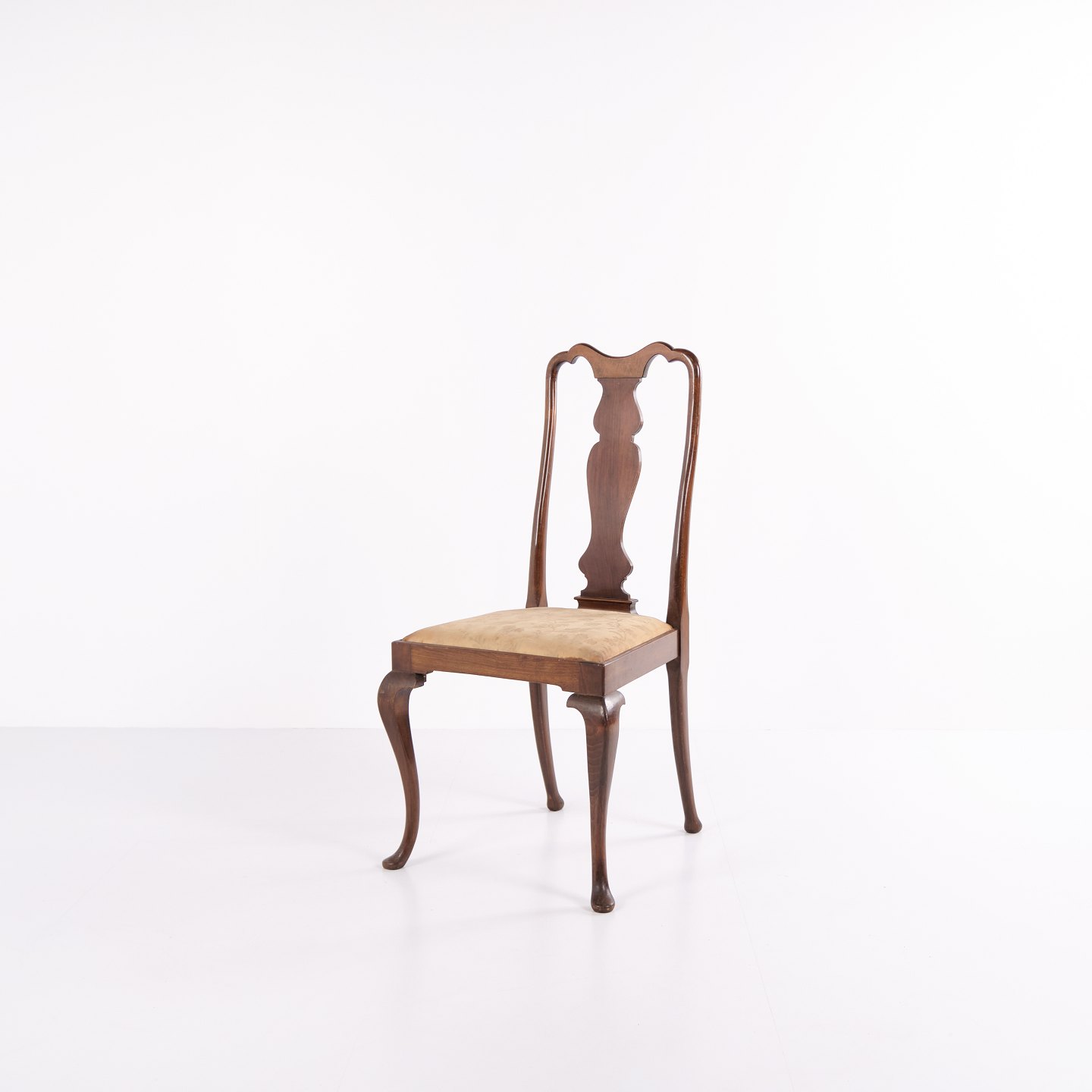 Sæt af tre spisebordsstole i Louis XV stil fra 1900-tallet, udført i mahogni med udskårne detaljer og polstret med blomstret stof. Klassiske og dekorative stole, velegnede til spiseområde eller stue. Solidt håndværk med tidstypisk formsprog.