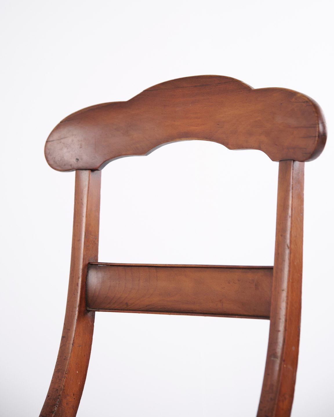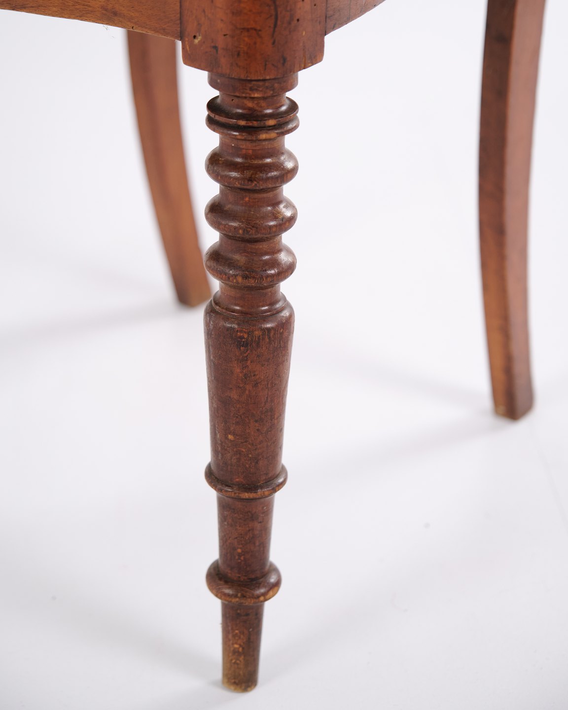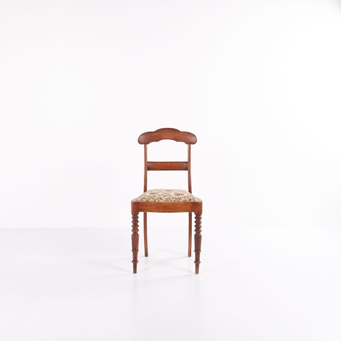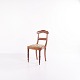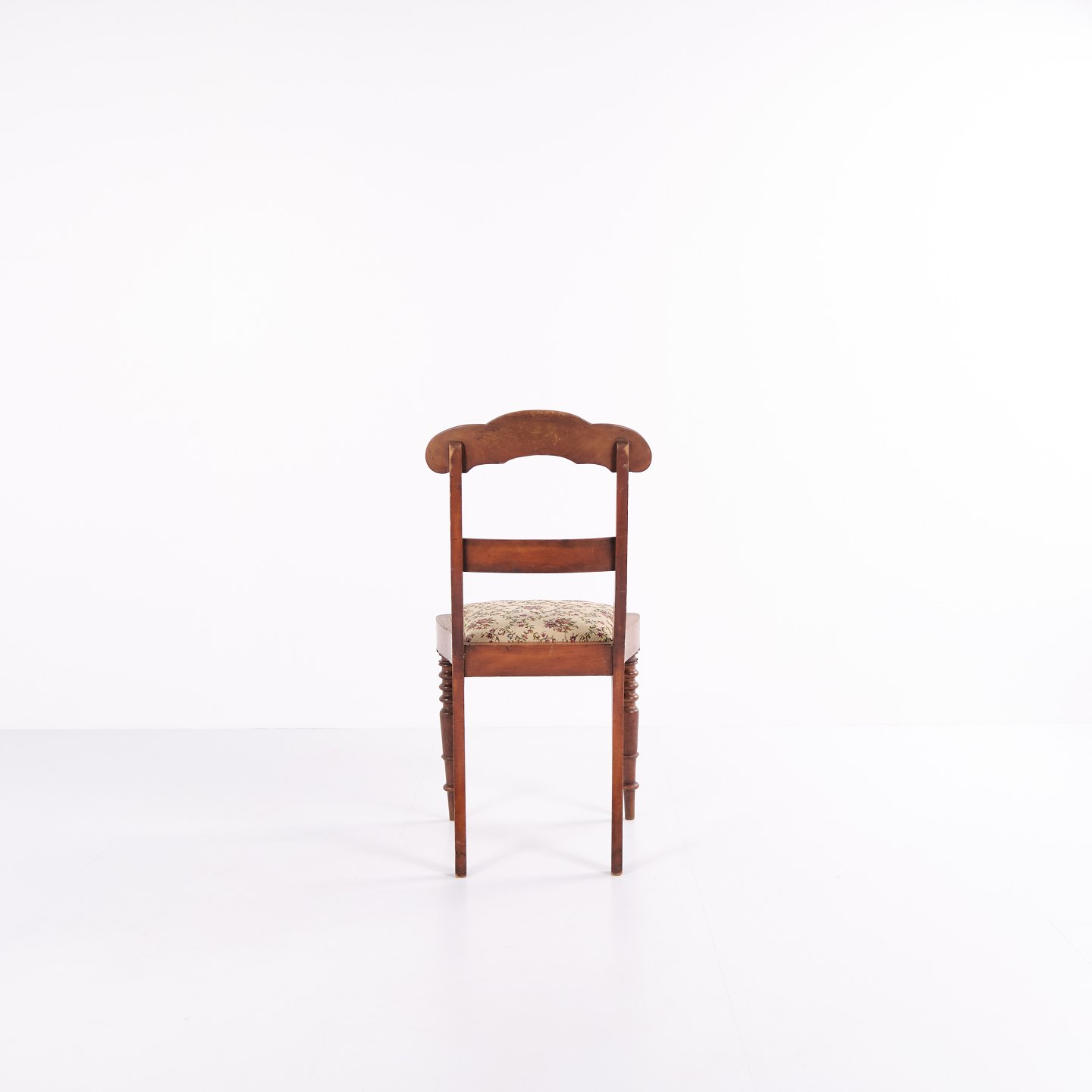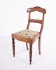 Spisebords- eller entréstol i sen Empire stil, udført i mahogni og polstret med blomstret stof. Klassisk design med tidstypiske linjer og let buet ryg. En dekorativ stol, der egner sig til både spiseområde og entré.