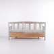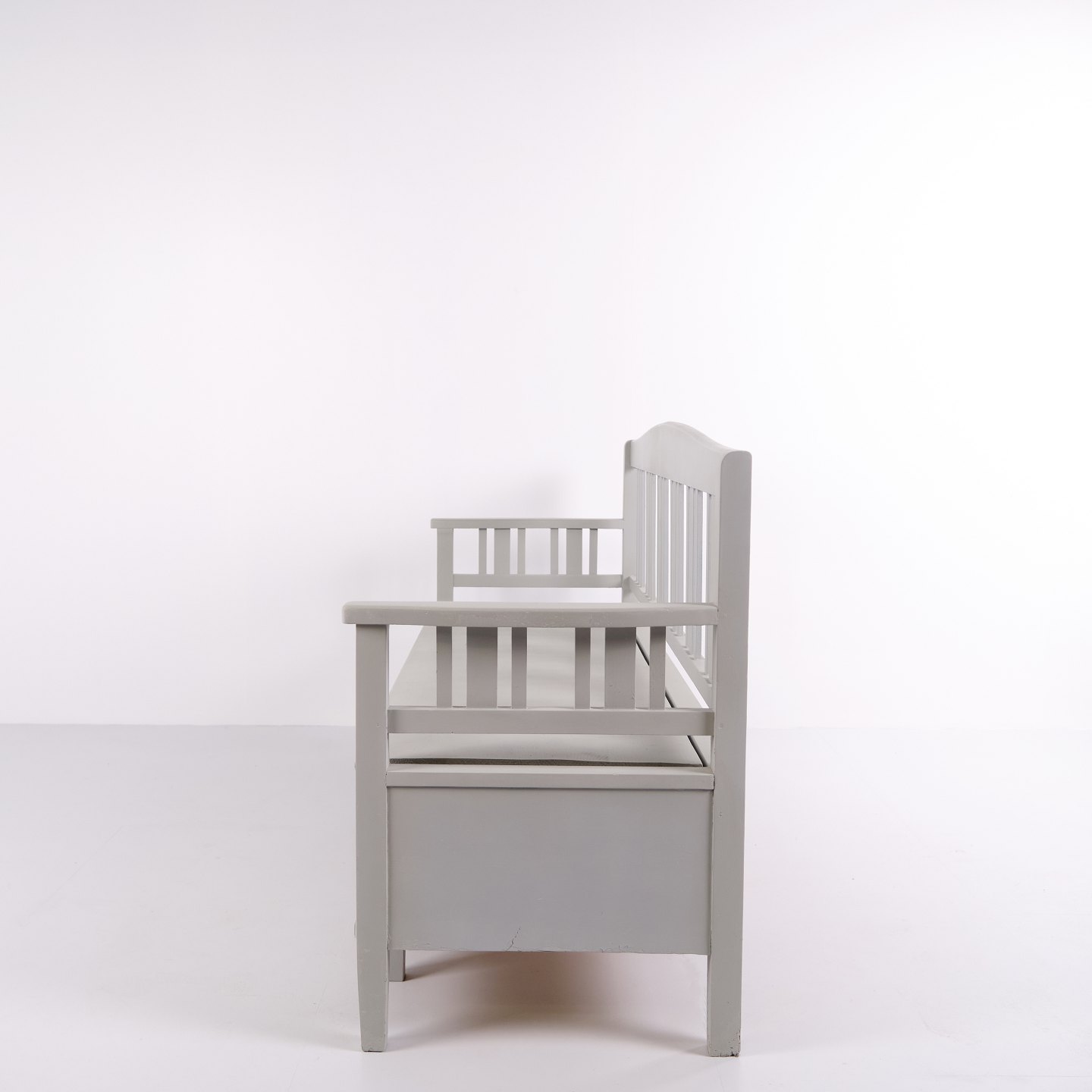 Svensk slagbænk fra ca. 1860’erne, udført i fyrretræ og gråmalet i senere tid. Klassisk skandinavisk møbel med dekorative bemalinger og god opbevaringsplads under sædet. Velbevaret antikt møbel med tidstypiske detaljer.