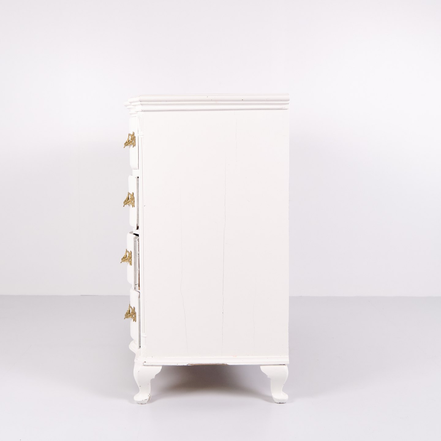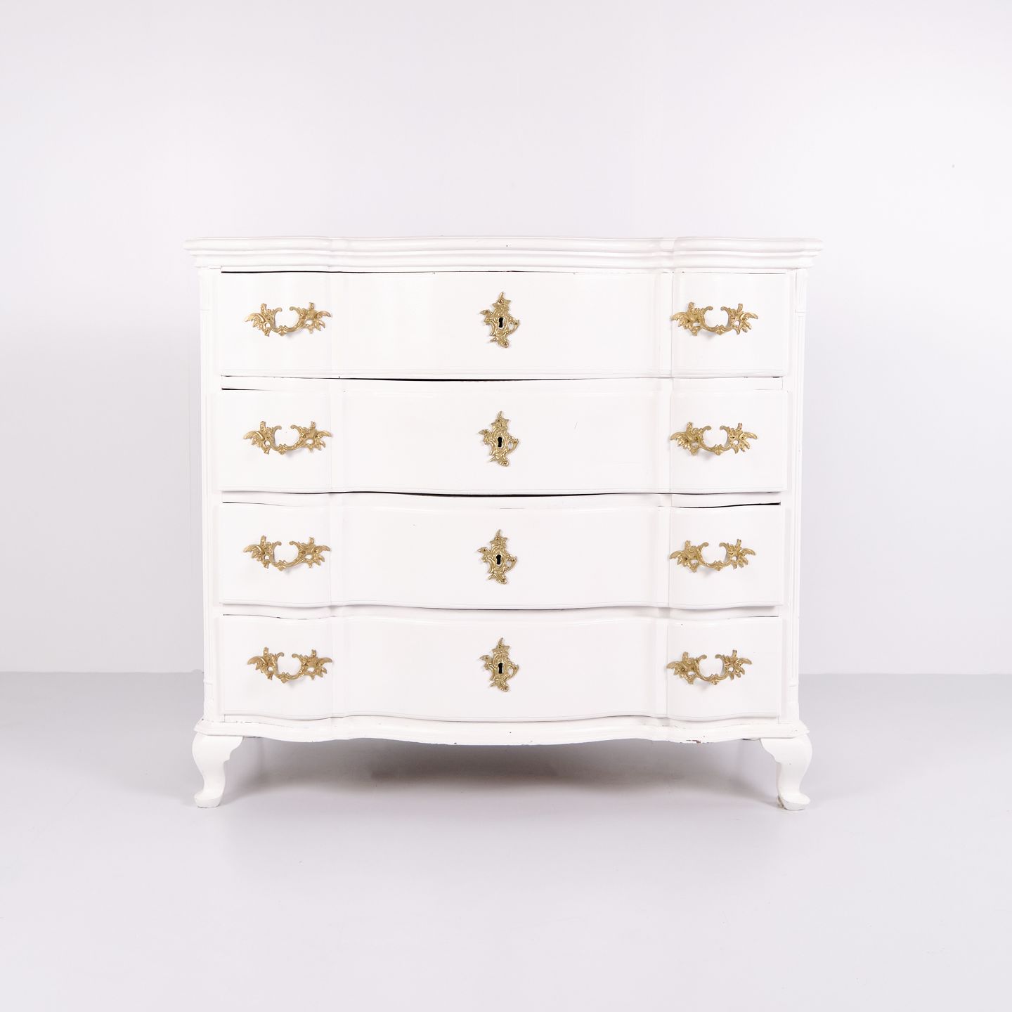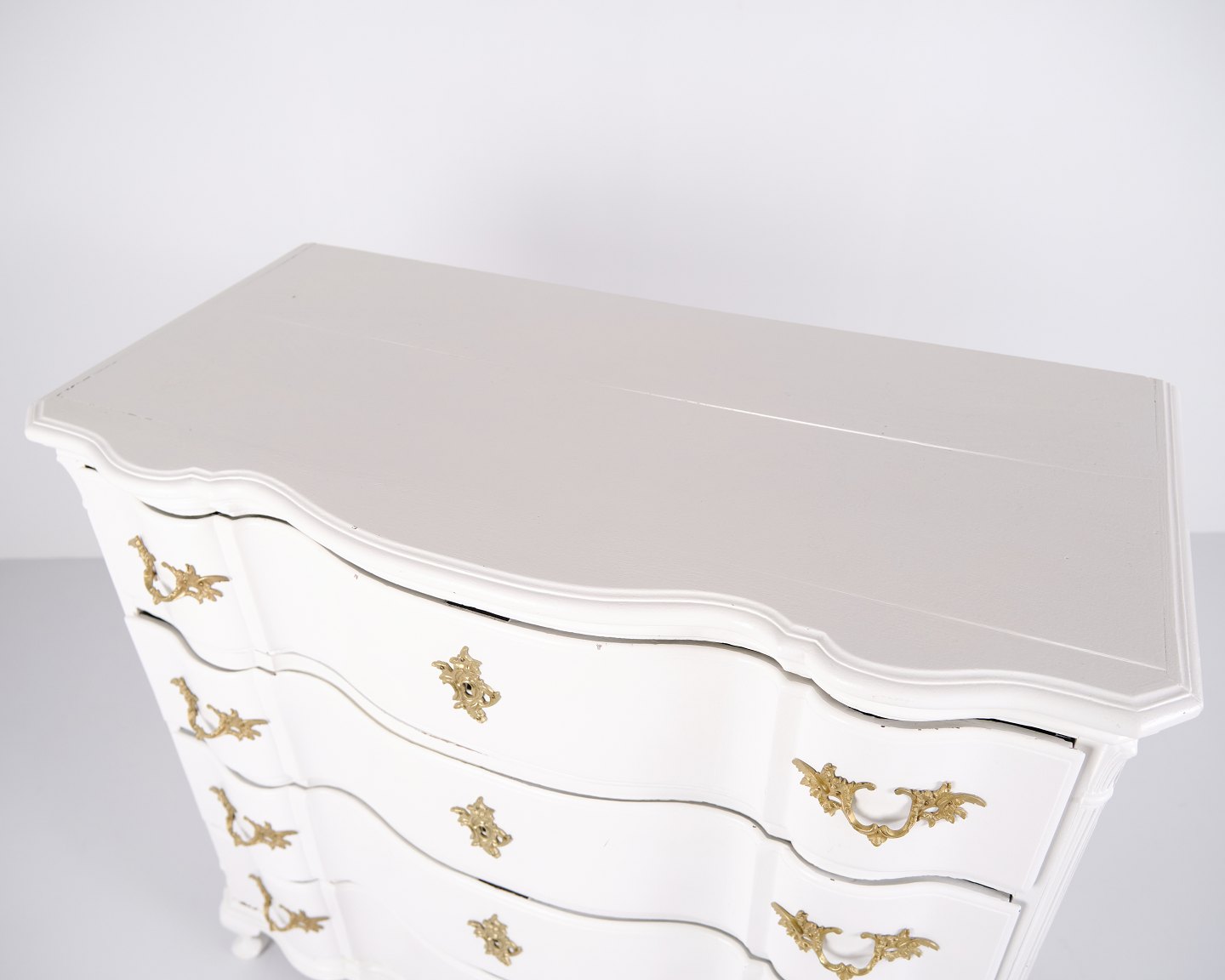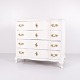 Antik barok kommode fra 1760’erne, hvidmalet med messinggreb. Fire skuffer og markant barokt formsprog. Historisk og dekorativt møbel.