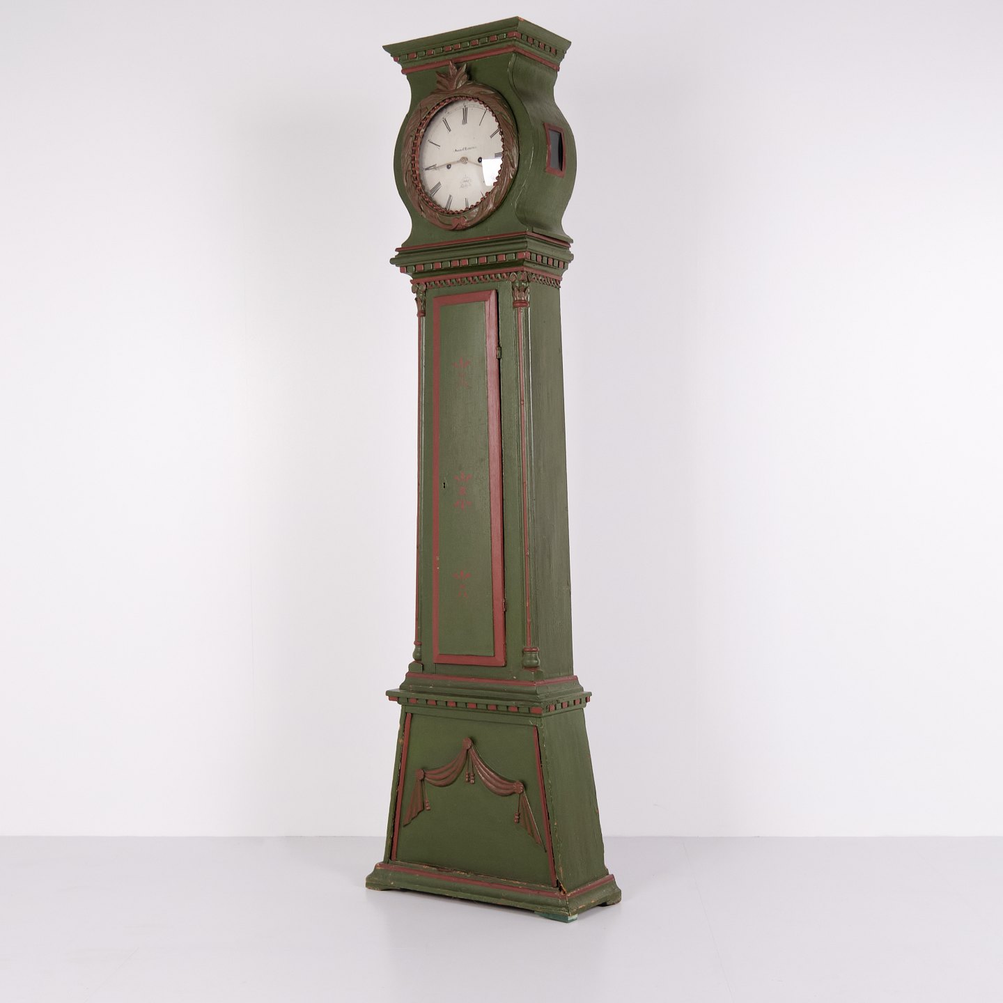 Bornholmerur frøkenmodel 1860’erne, håndmalet med udskårne detaljer i grøn/rød bemaling. Antikt bornholmer ur 1800-tallet.