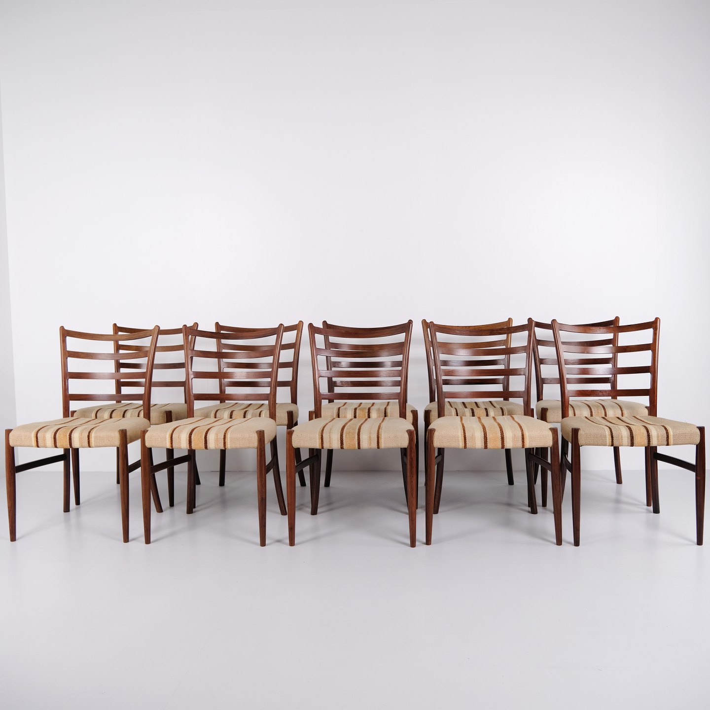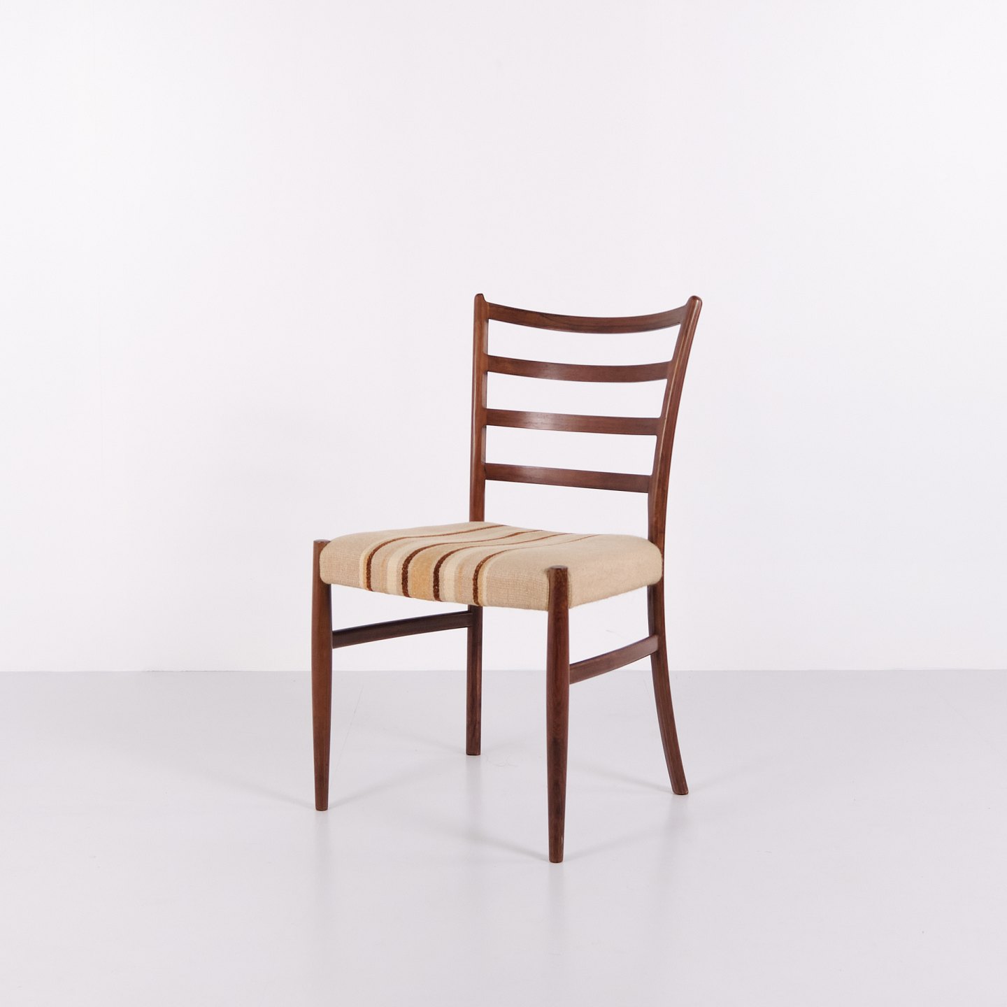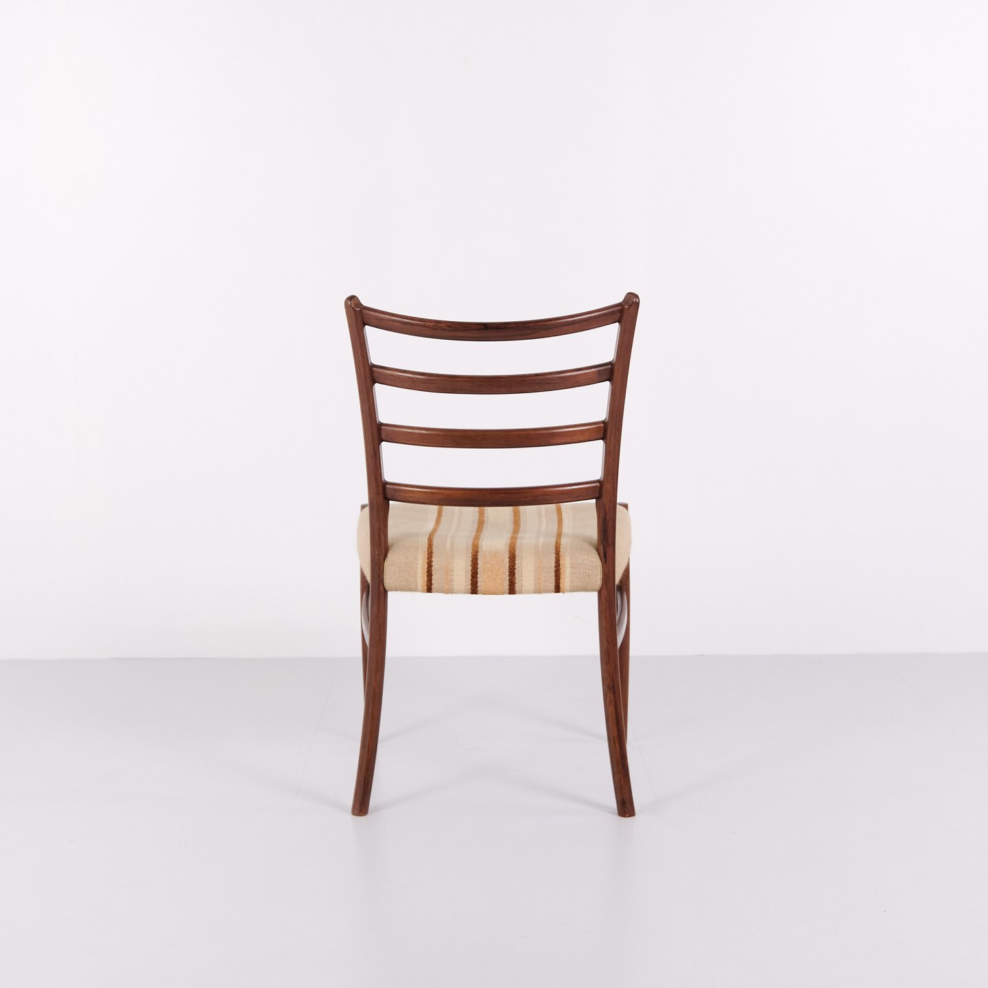 N.O. Møller spisebordsstole i palisander med stribet polster fra 1960’erne. Design af J.L. Møllers Møbelfabrik.