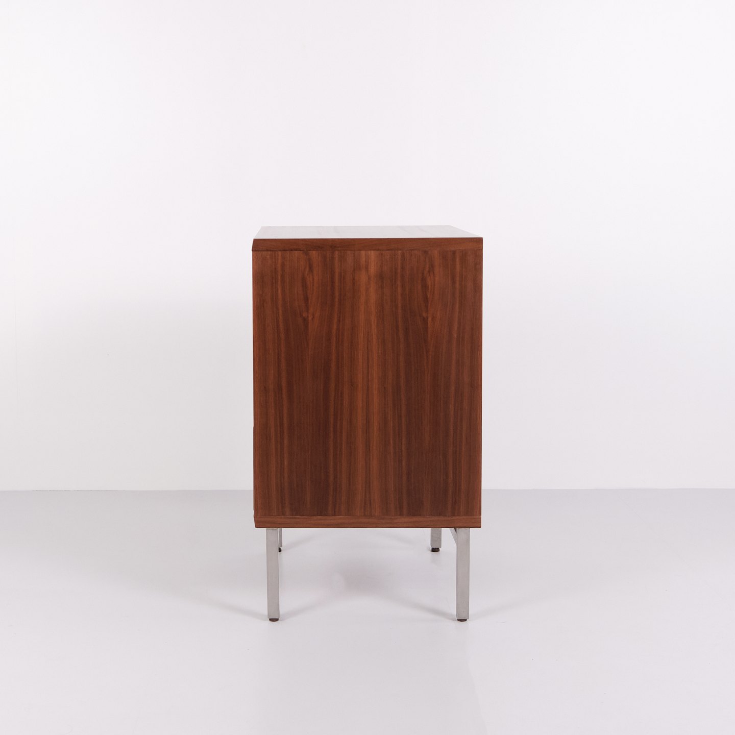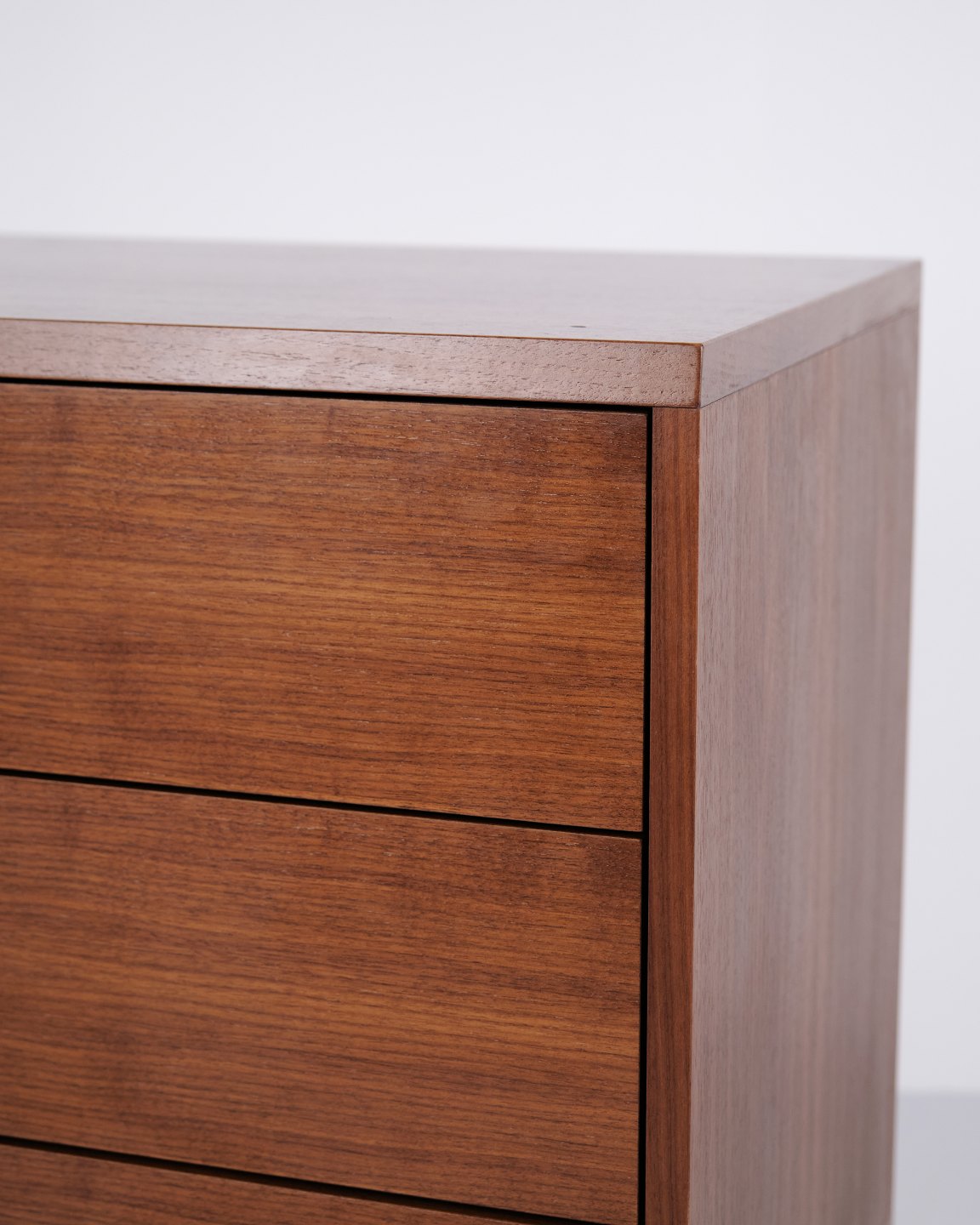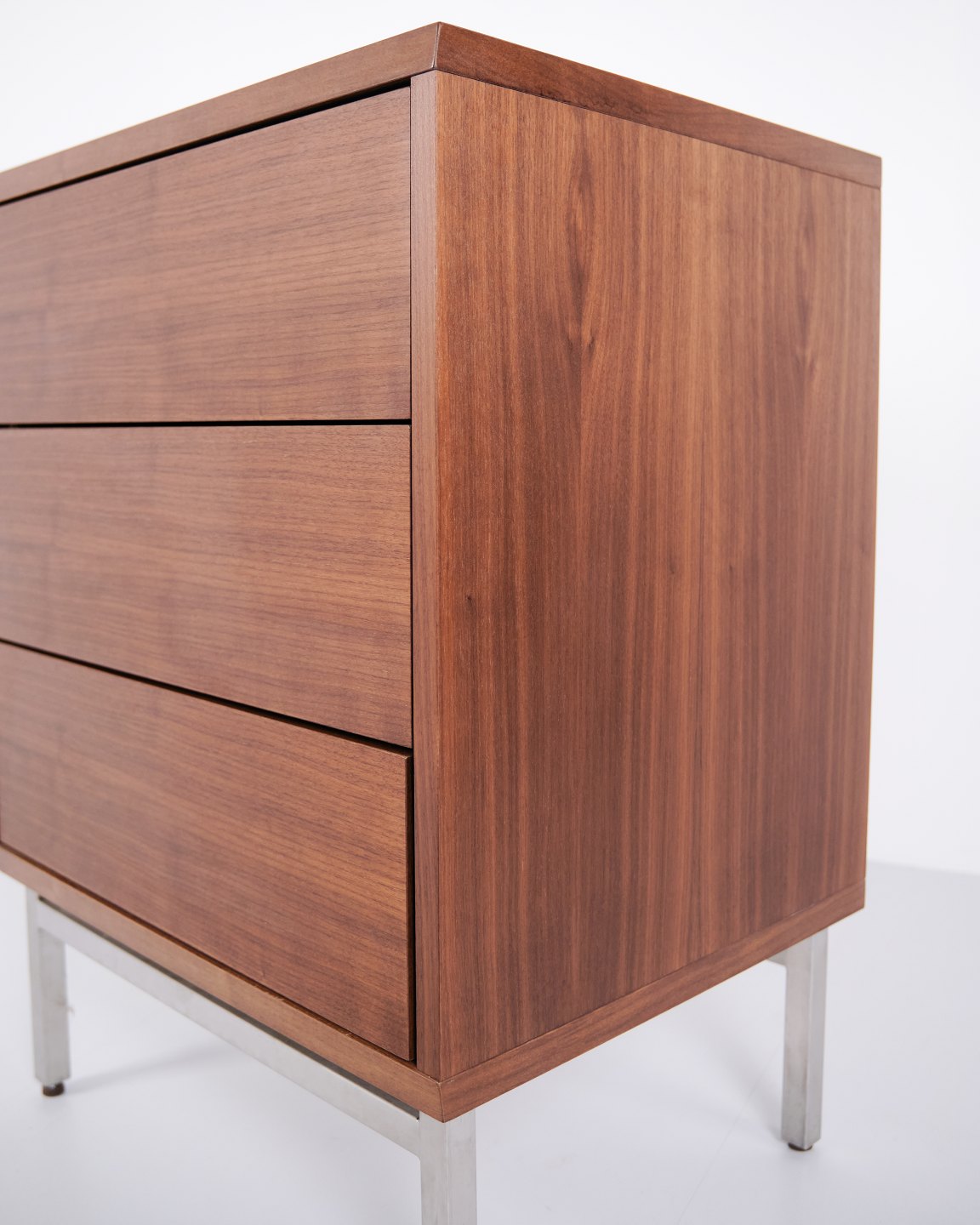 Skovby kommode i valnød med 3 skuffer og metalben. Moderne dansk møbel fra Skovby Møbelfabrik.