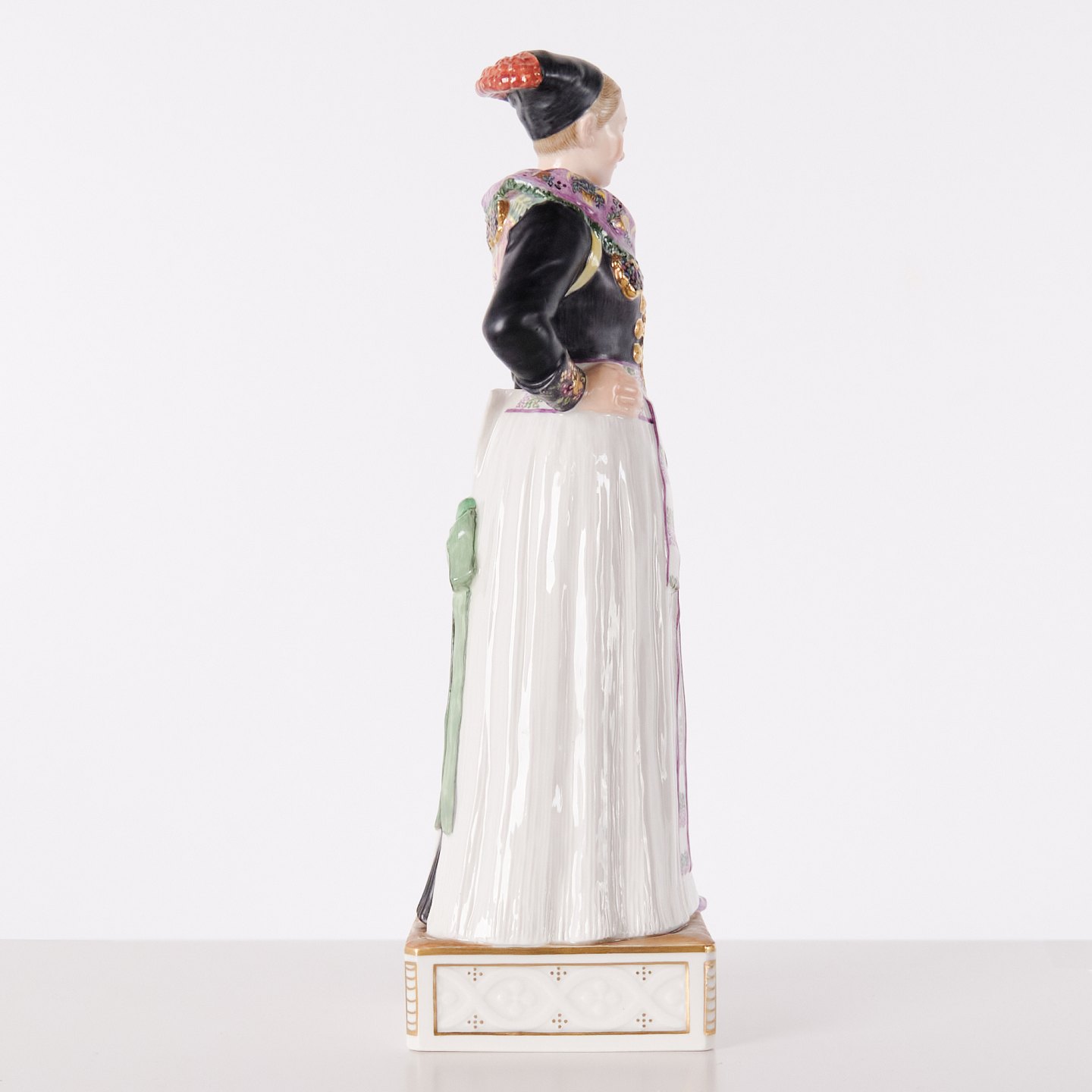 Overglasur porcelænsfigur i dansk nationaldragt, model 12104, forestillende kokkedragt fra Amager. Figuren er designet af Carl Martin-Hansen (1877–1941) for Royal Copenhagen og indgår i serien Danske Nationaldragter.