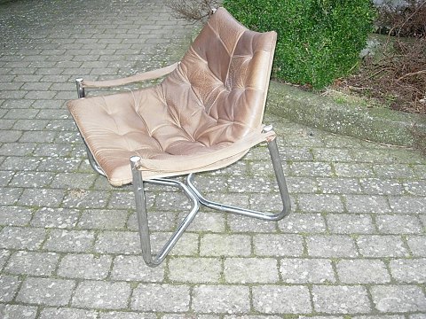 SolgtEt par hvilestole i svensk design.Udført i brunt kernelæder med stål ben .5000 m2 udstilling.Prisen for parret er 4800 kr