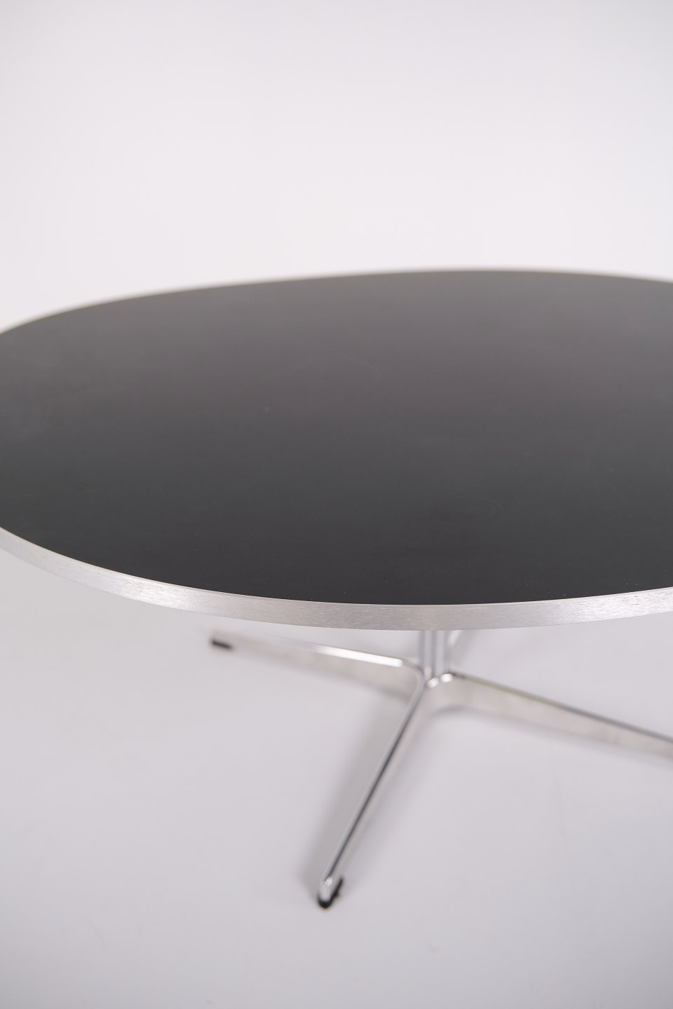 Dette eksemplar er fremstillet hos Fritz Hansen i 2023 og er udført med stel i aluminium og bordplade i sort laminat. Bordet fremstår som et nutidigt eksempel på det klassiske danske design.