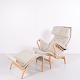Pernilla lænestol med tilhørende skammel, model 69, designet af Bruno Mathsson og fremstillet af DUX som 35 års jubilæumsudgave. Stolen er udført i bøgetræ med polstring i lyst stof og har et karakteristisk, ergonomisk formsprog, der følger kroppens naturlige kurver og sikrer høj komfort.