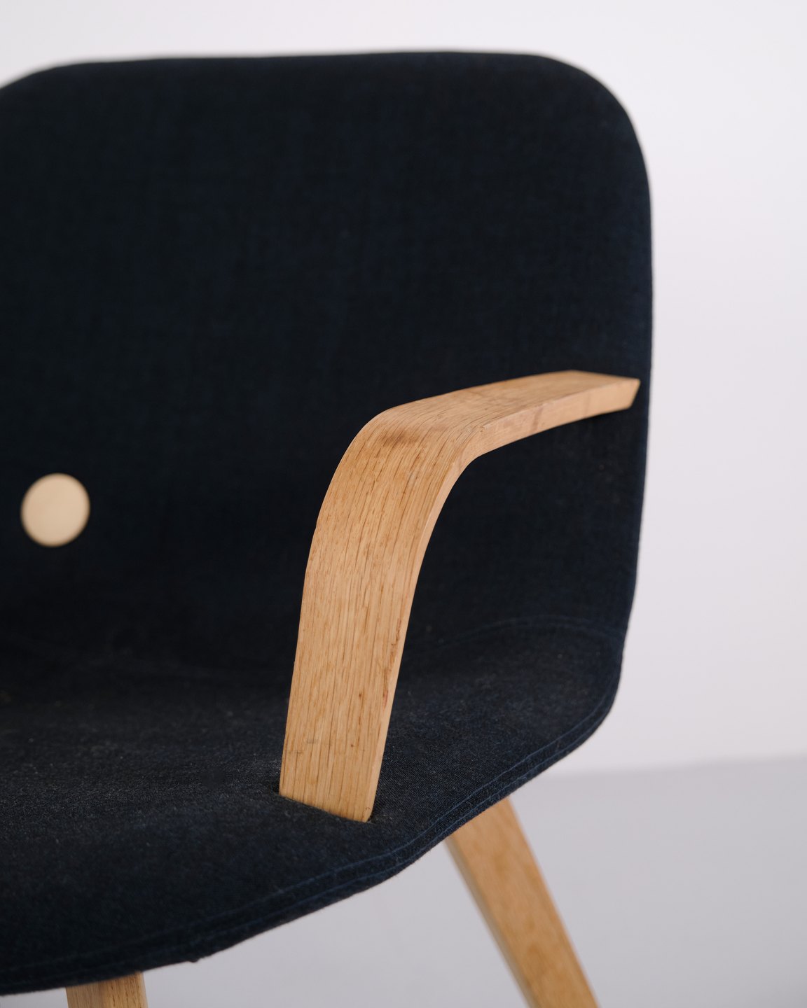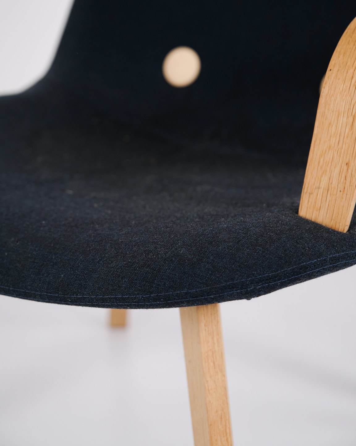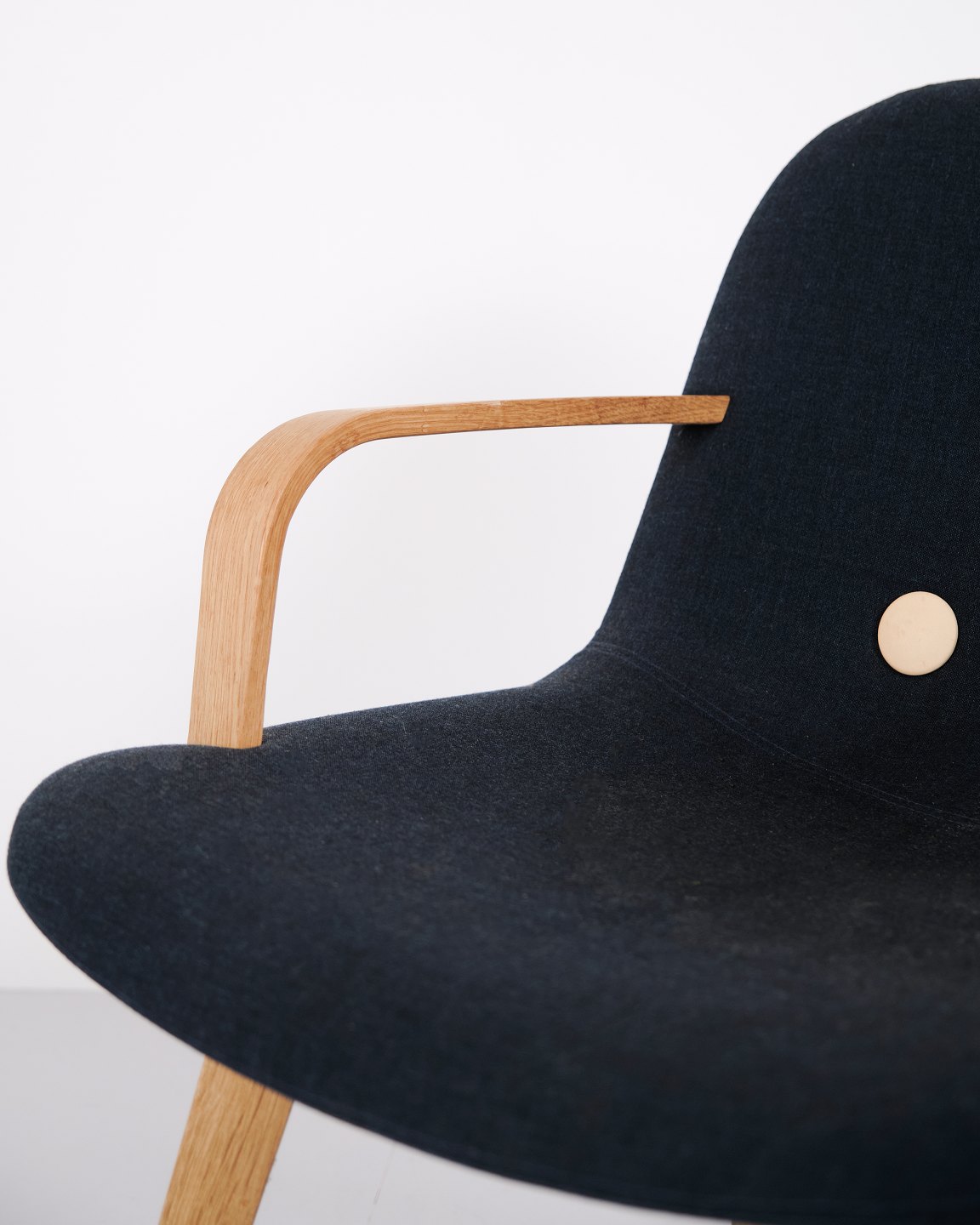 Erik Jørgensen loungestol model EJ 3 i egetræ og blåt stof. Dansk design med enkelt og tidløst formsprog.