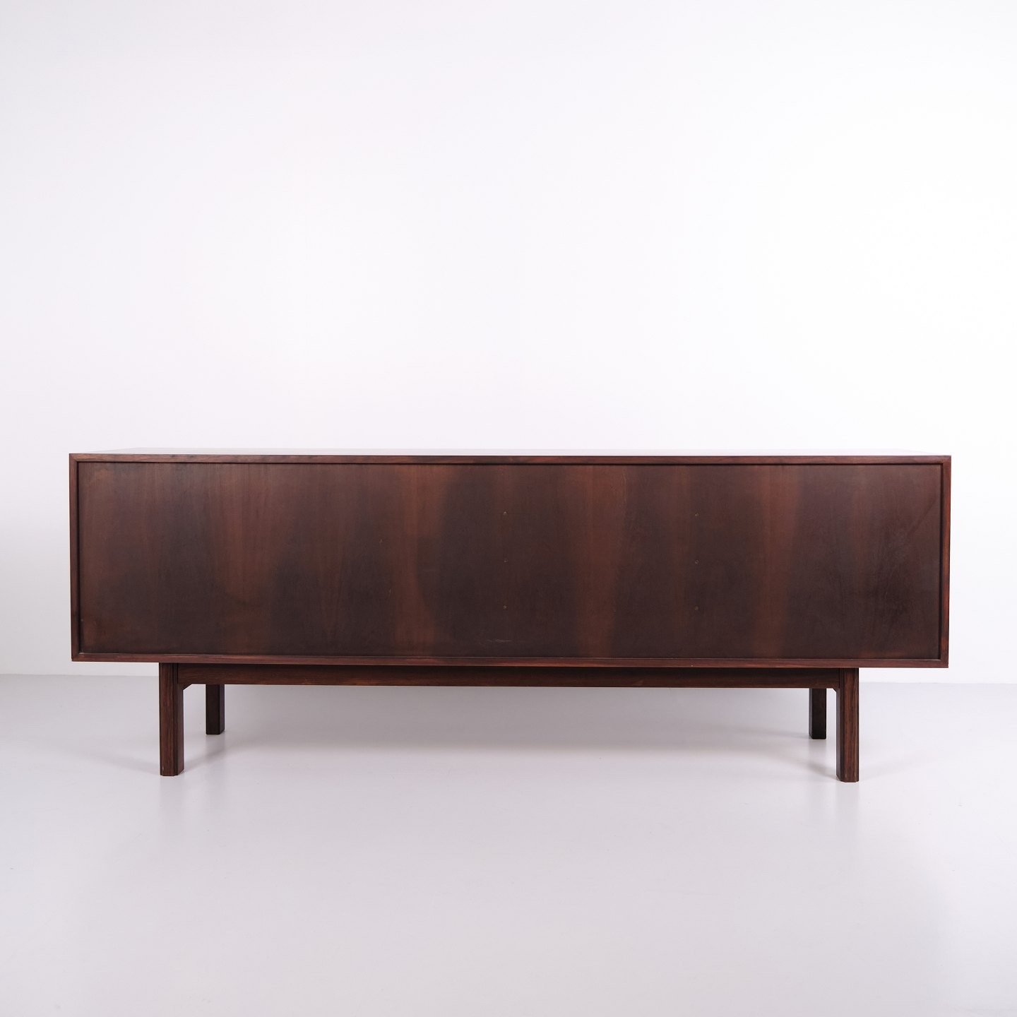 Skænken har to skydelåger med indfræsede greb i massivt palisander. Indvendigt findes fire udtræksskuffer samt hylder, som giver gode opbevaringsmuligheder og gør møblet velegnet til både stue og spisestue.