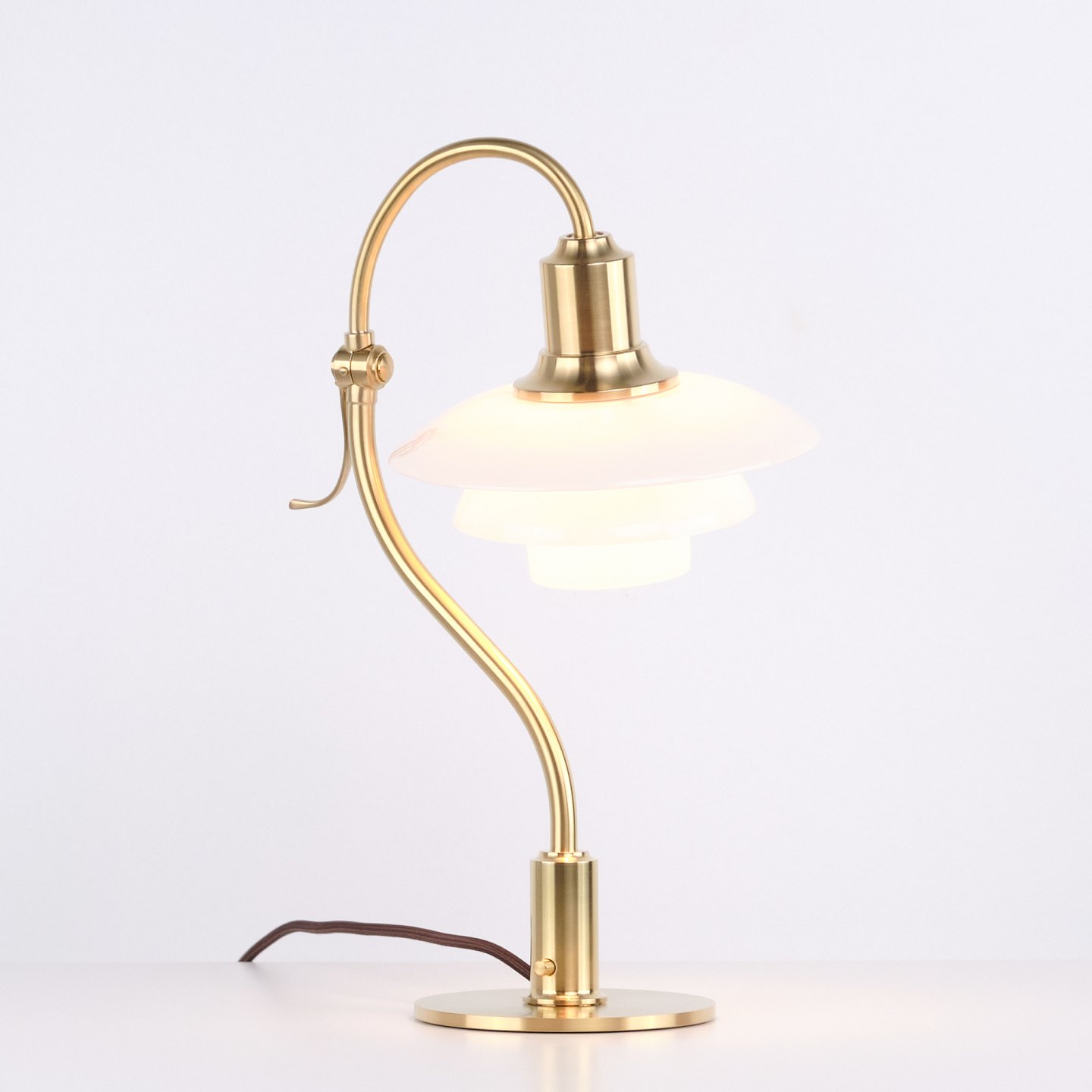 Eksklusiv PH 2/2 “Spørgsmålstegnet” bordlampe designet af Poul Henningsen og udgivet som Limited Edition i 2021 af Louis Poulsen. Lampen er udført i børstet messing med skærme i hvidt opalglas og har den karakteristiske buede form, som har givet modellen sit navn.
