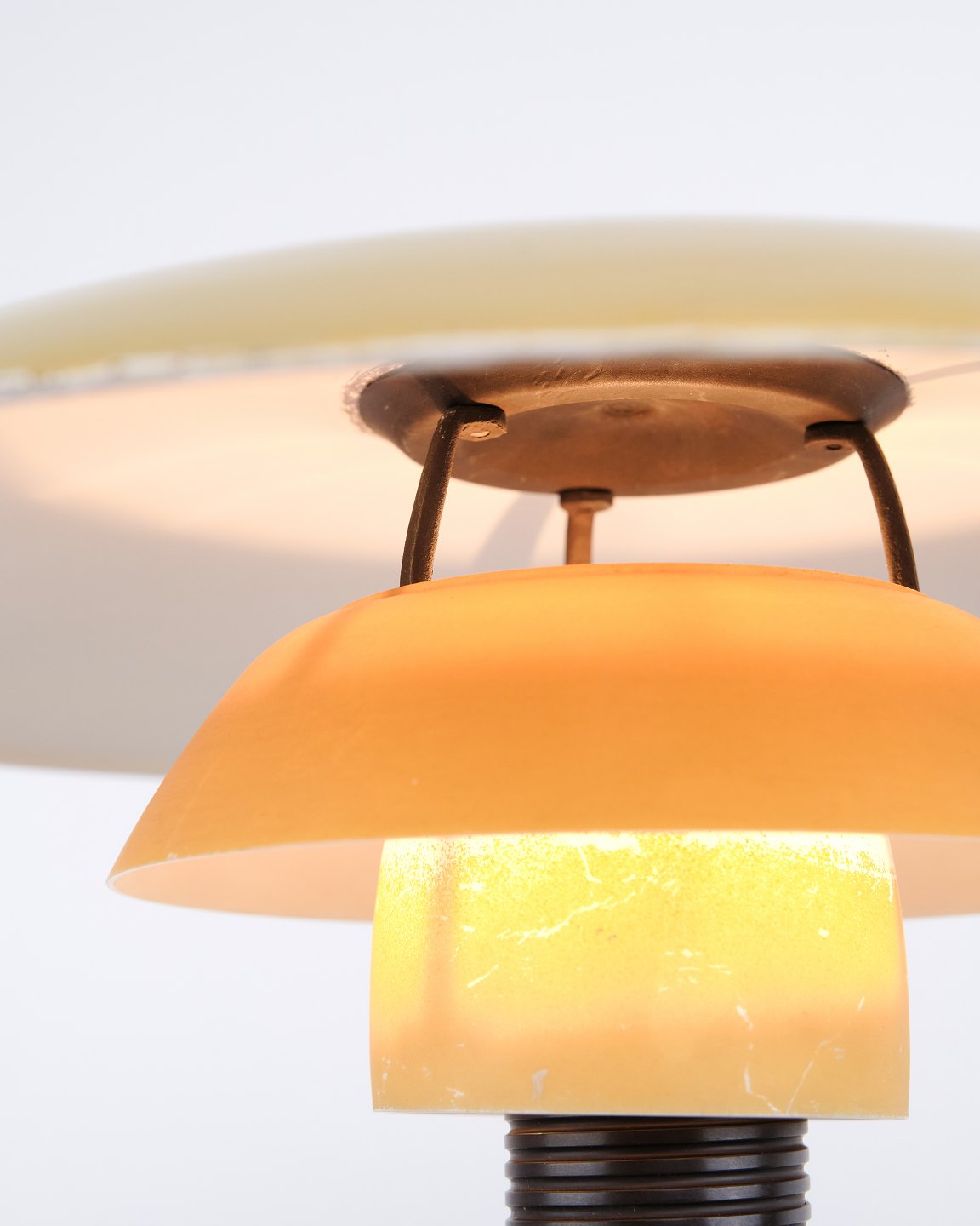 PH 3½/2½ bordlampe designet af Poul Henningsen og fremstillet af Louis Poulsen i 1930’erne. Lampen har gul metal overskærm samt mellem- og bundskærme i gulmalet opalglas, hvilket giver et varmt og karakterfuldt lys. Kombinationen af materialer og farver understreger lampens funktionelle og dekorative udtryk.