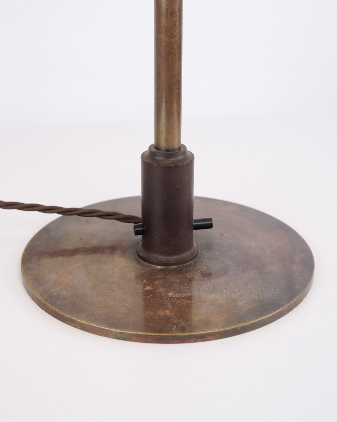 PH 4/3 bordlampe designet af Poul Henningsen og fremstillet af Louis Poulsen i 1930’erne. Lampen er udført i bruneret messing med skærme i hvidt opalglas, hvilket giver et varmt og afbalanceret lys. Det ikoniske flerskærmssystem er udviklet til at sikre blændfri belysning og optimal lysfordeling.