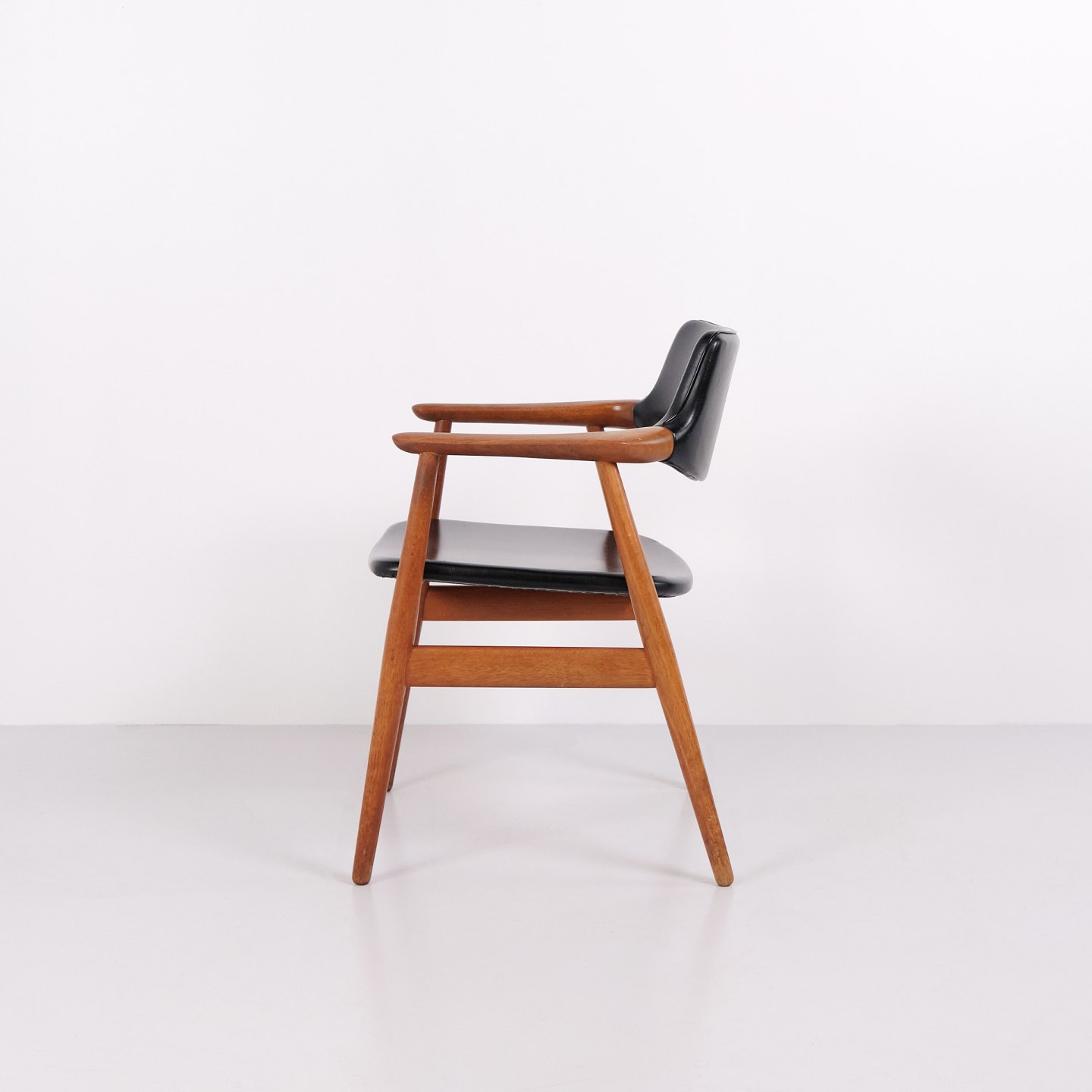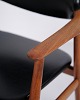 Sæt af 6 GM11 spisestuestole designet af Svend Aage Eriksen for Glostrup Møbelfabrik i 1960’erne. Stolene er udført i massiv teak med sort læder på sæde og ryg. Model GM11 er kendt for de organiske linjer, let svungne armlæn og høj siddekomfort. Et klassisk dansk design med elegant snedkerarbejde og flotte proportioner, velegnet til både spisebord og mødelokale. Sættet sælges kun samlet.