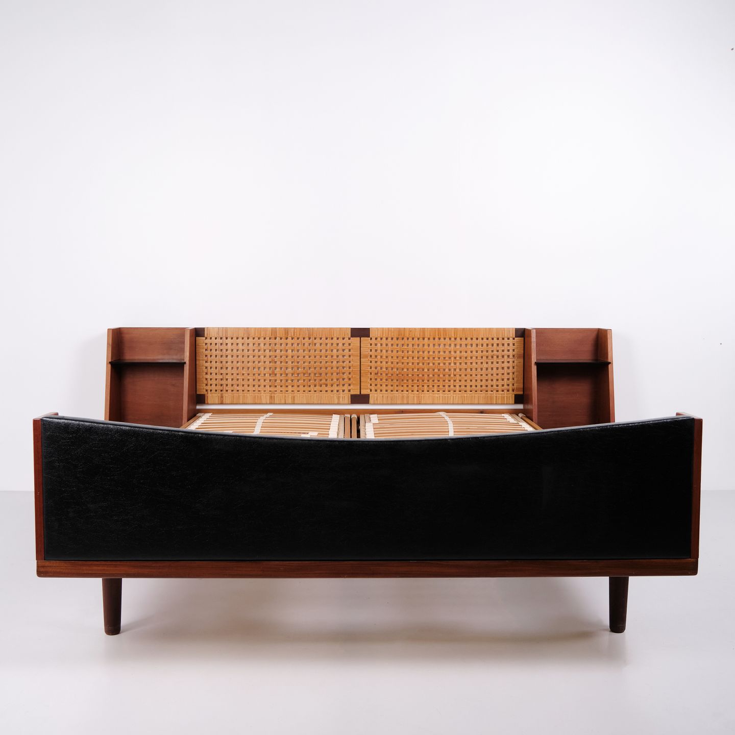 Model GE 701 dobbeltseng designet af Hans J. Wegner og fremstillet hos Getama i 1950’erne. Udført i fineret og massivt teaktræ. Gavle med sjeneflet og sort kunstlæder. Hovedgavl med integrerede sengeborde med hylder i sort glas samt underliggende hylde. Messingbeslag. Hans J. Wegner samarbejdede gennem mange år med Getama og udviklede flere møbler i teak til boligindretning og soveværelse.