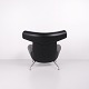 Ox Chair model EJ100 med tilhørende skammel designet af Hans J. Wegner. Modellen blev tegnet i 1960 og produceres i dag af Fredericia Furniture efter overtagelsen af Erik Jørgensen. Stolen er udført i sort læder med stel i stål. Det markante ryglæn med “horn” gav modellen navnet Ox Chair. ´