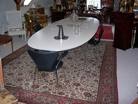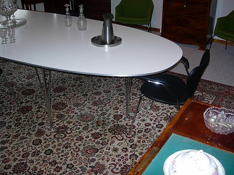 Piet hein bord Super elipse med hvid laminat.Længde 420 *140 med 10 stål ben i meget fin stand .5000 m2 udstilling