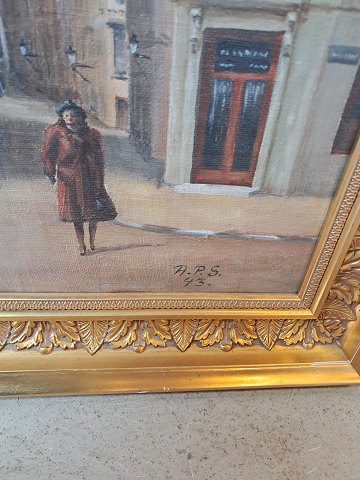 Maleri af Nikolaj kirke i guldmalet ramme, fra 1950erne.