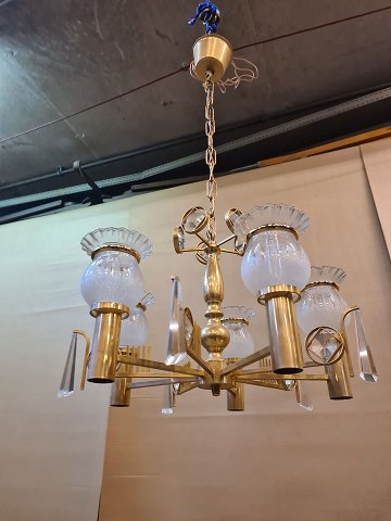 Lysekrone i messing med glas- skærme og prismer fra 1970´erne. Fremstår funktionsdygtig og uden brugsspor.