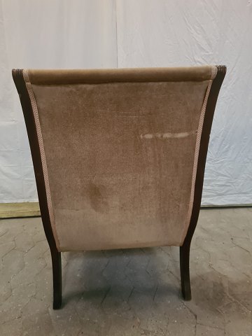 Lænestol i mahogni med velourbetræk, fra 1980erne.