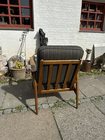 Dansk møbelproducent lænestol med armlæn af massiv eg samt stel af bejset bøg og hynder betrukket med uld stof.
