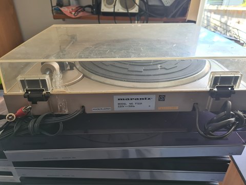 Pladespiller fra Marantz model TT 221. Nok mest til reservedele eller restaurering. Motoren kører og skiven drejer. Armen mangler modvægt. Fremstår med brugsspor. (Billede) |