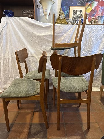 Dansk møbelproducent sæt af 5 spisestuestole i eg m. rygstykke i fineret teak samt sæde betrukket med stof. Fremstillet ca. 1950'erne.