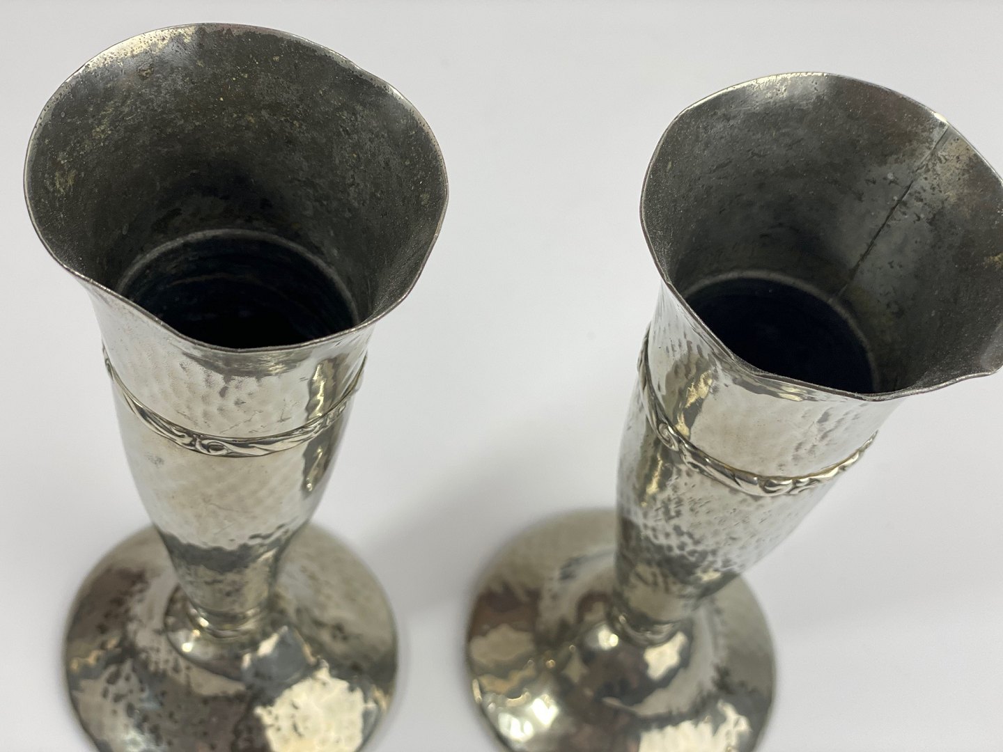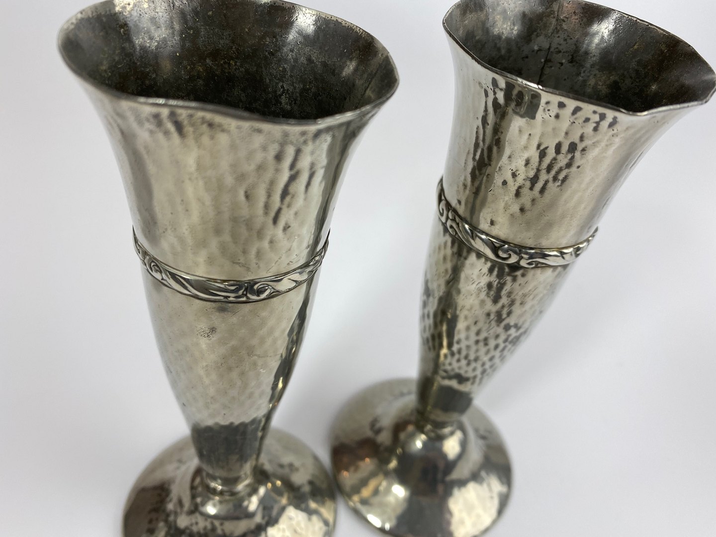 Smukke vaser af hvidt metal / tin i Art Nouveau / skønvirke design. Vaserne har en smuk patina. God stand, ujævne ved halsrand. De står meget fint.