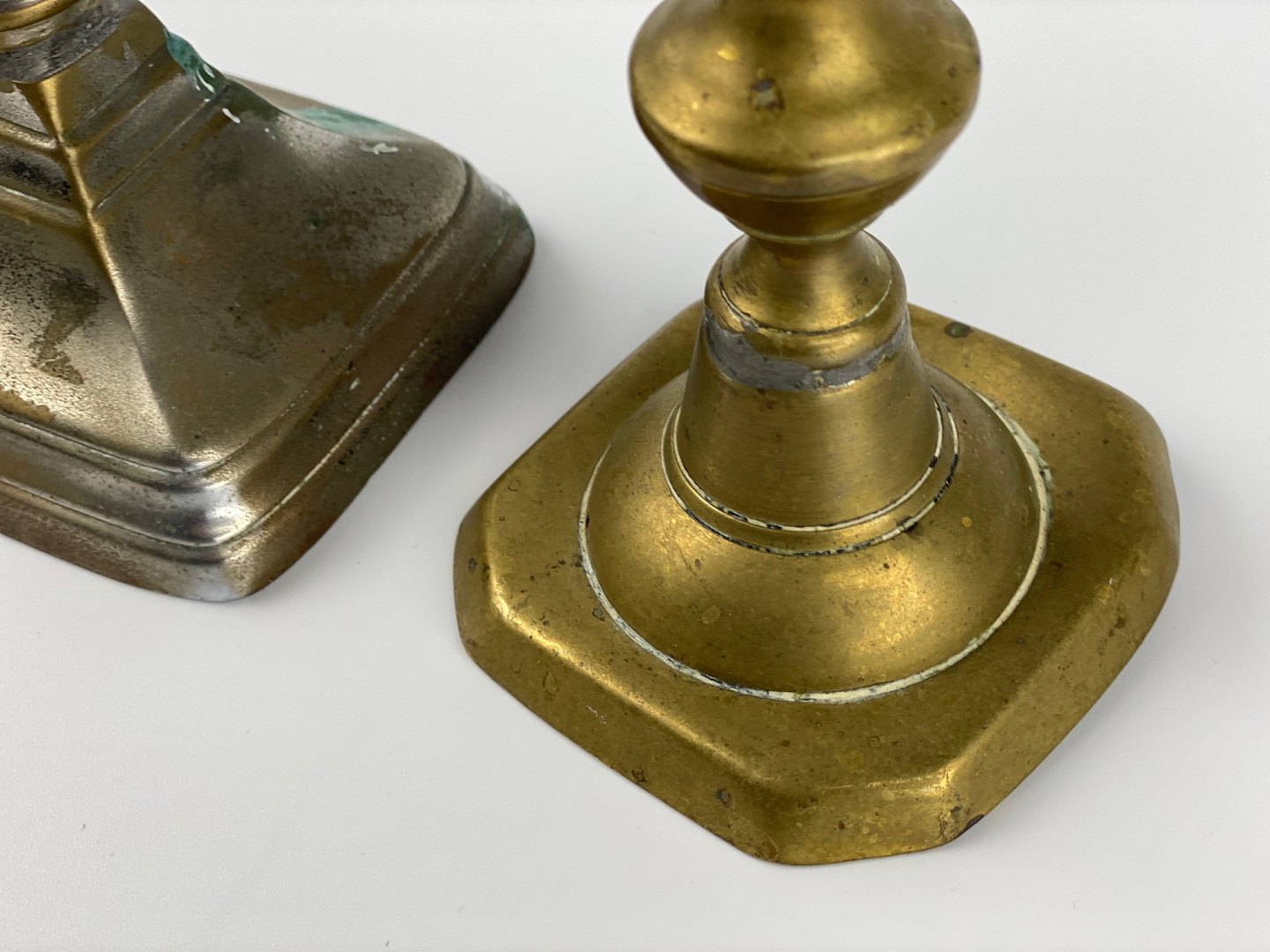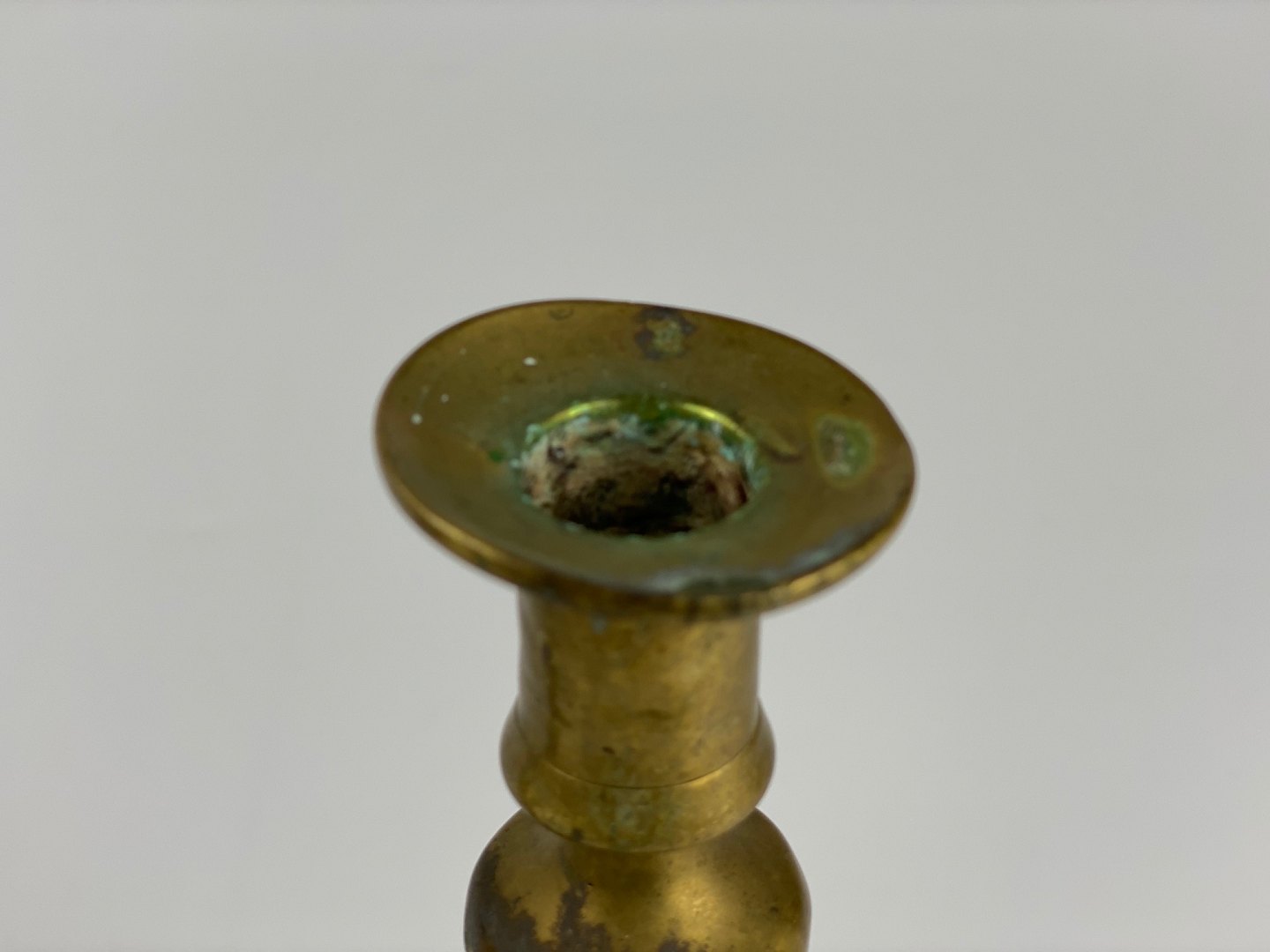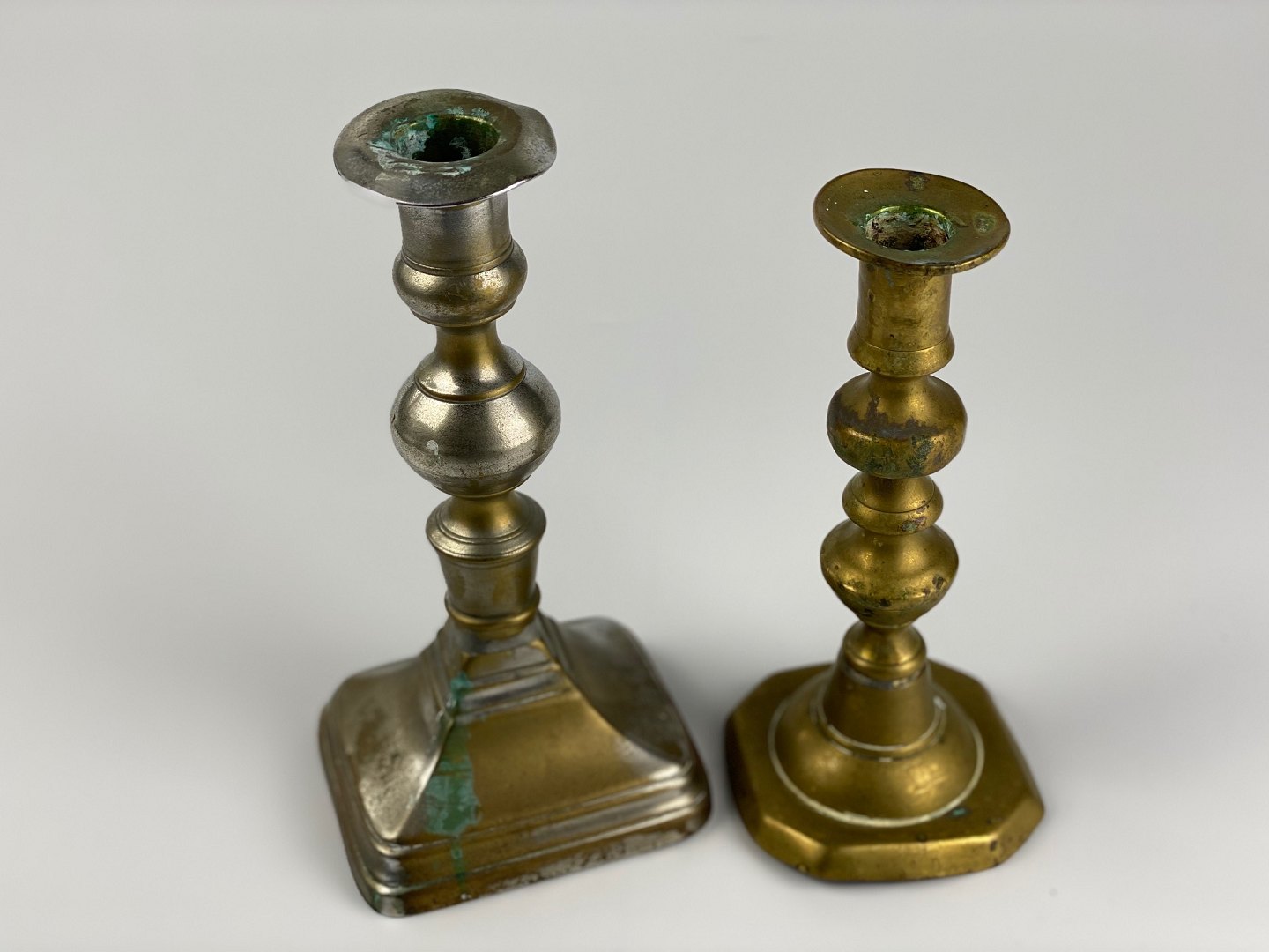 Umage par smukke, antikke engelske lysestager med "skub op" funktion/pind, som dog ikke virker mere. Stagerne har masser af patina, herunder skævheder og reparationer, så de i dag fremstår med masser af charme.