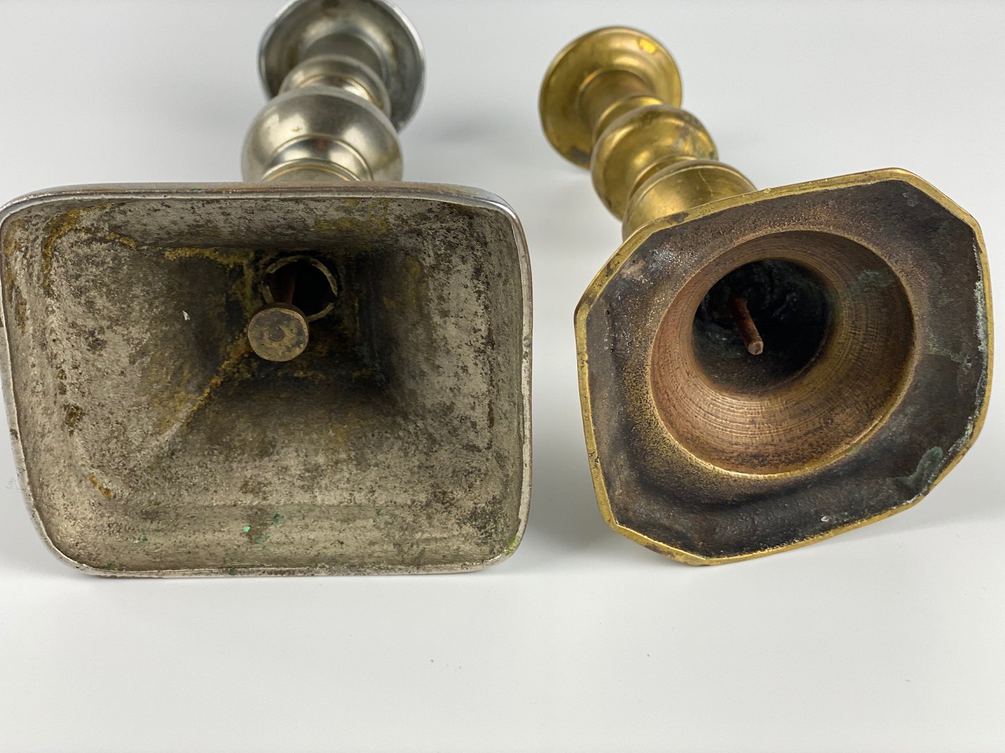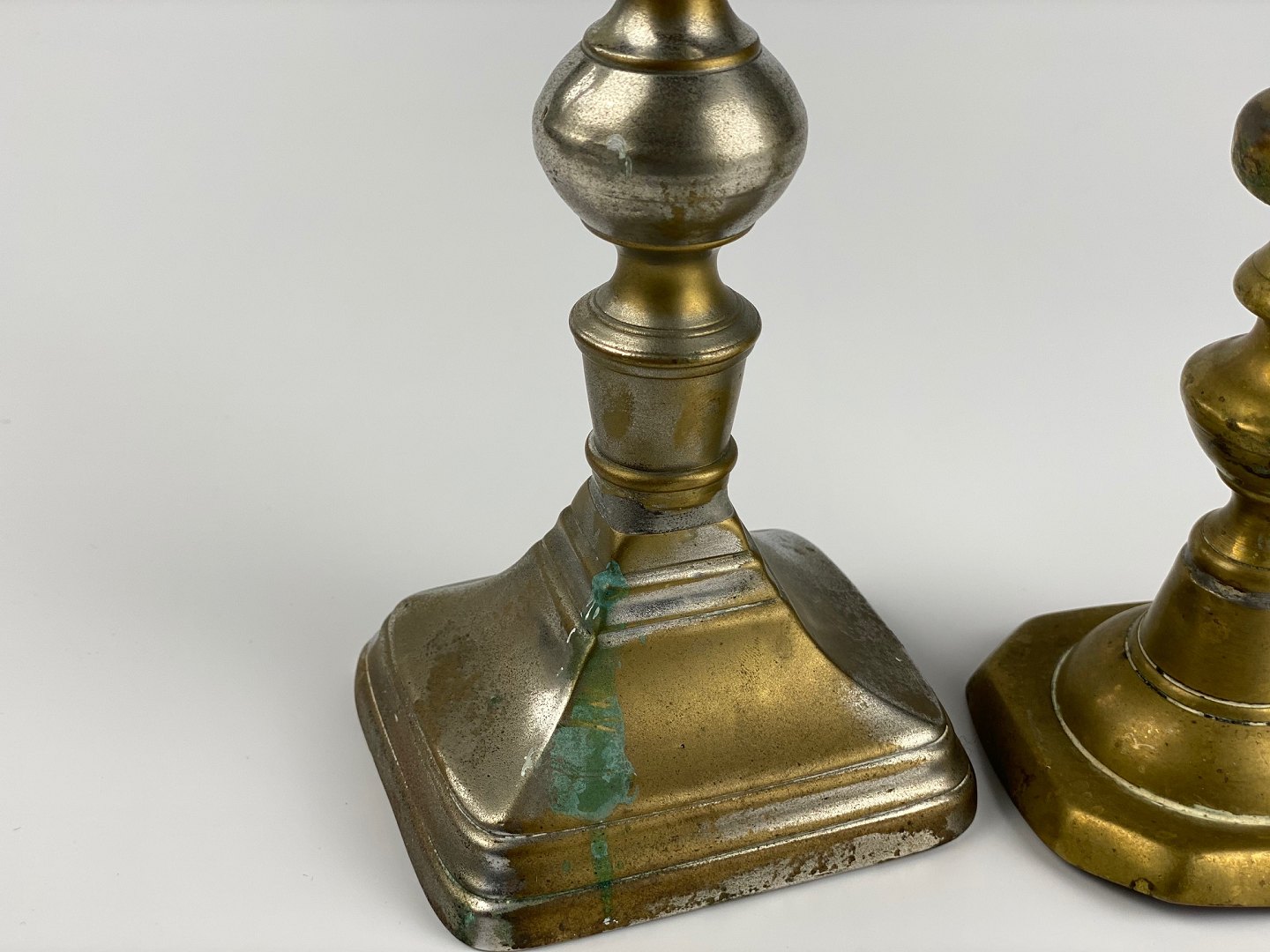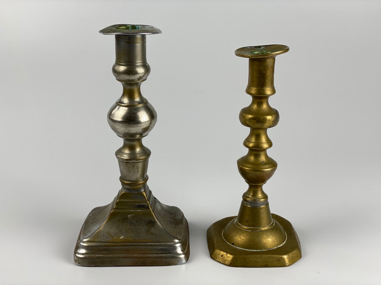 Umage par smukke, antikke engelske lysestager med "skub op" funktion/pind, som dog ikke virker mere. Stagerne har masser af patina, herunder skævheder og reparationer, så de i dag fremstår med masser af charme.