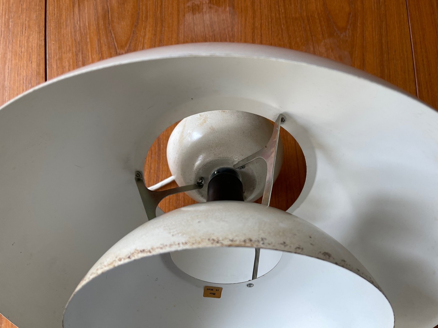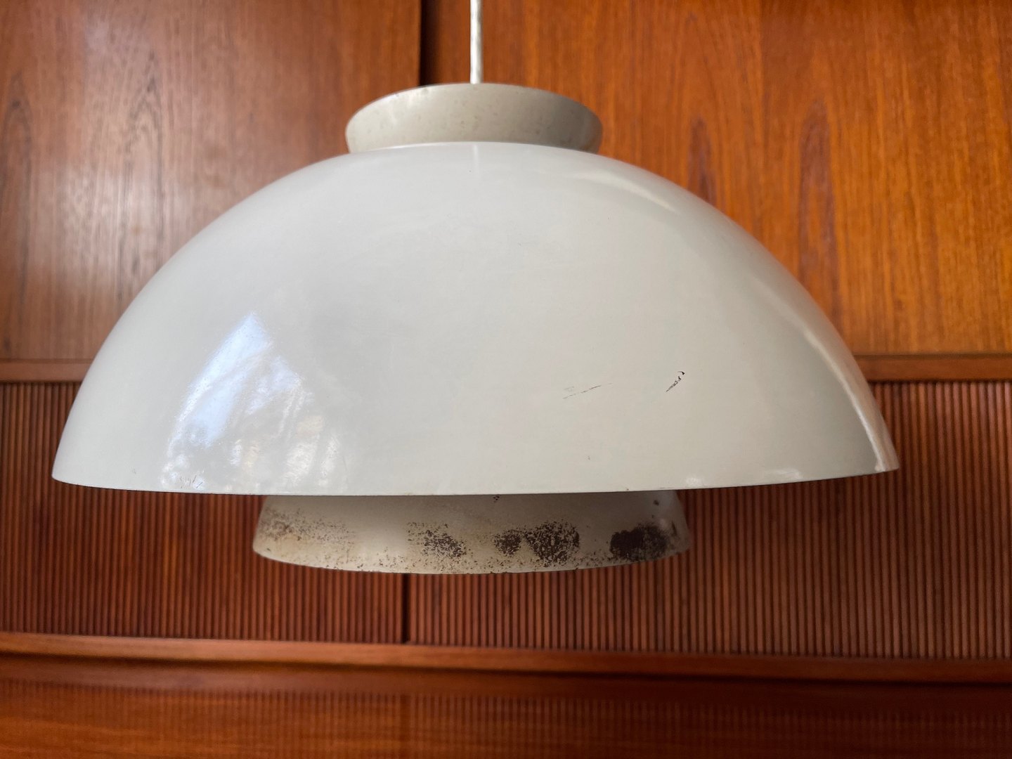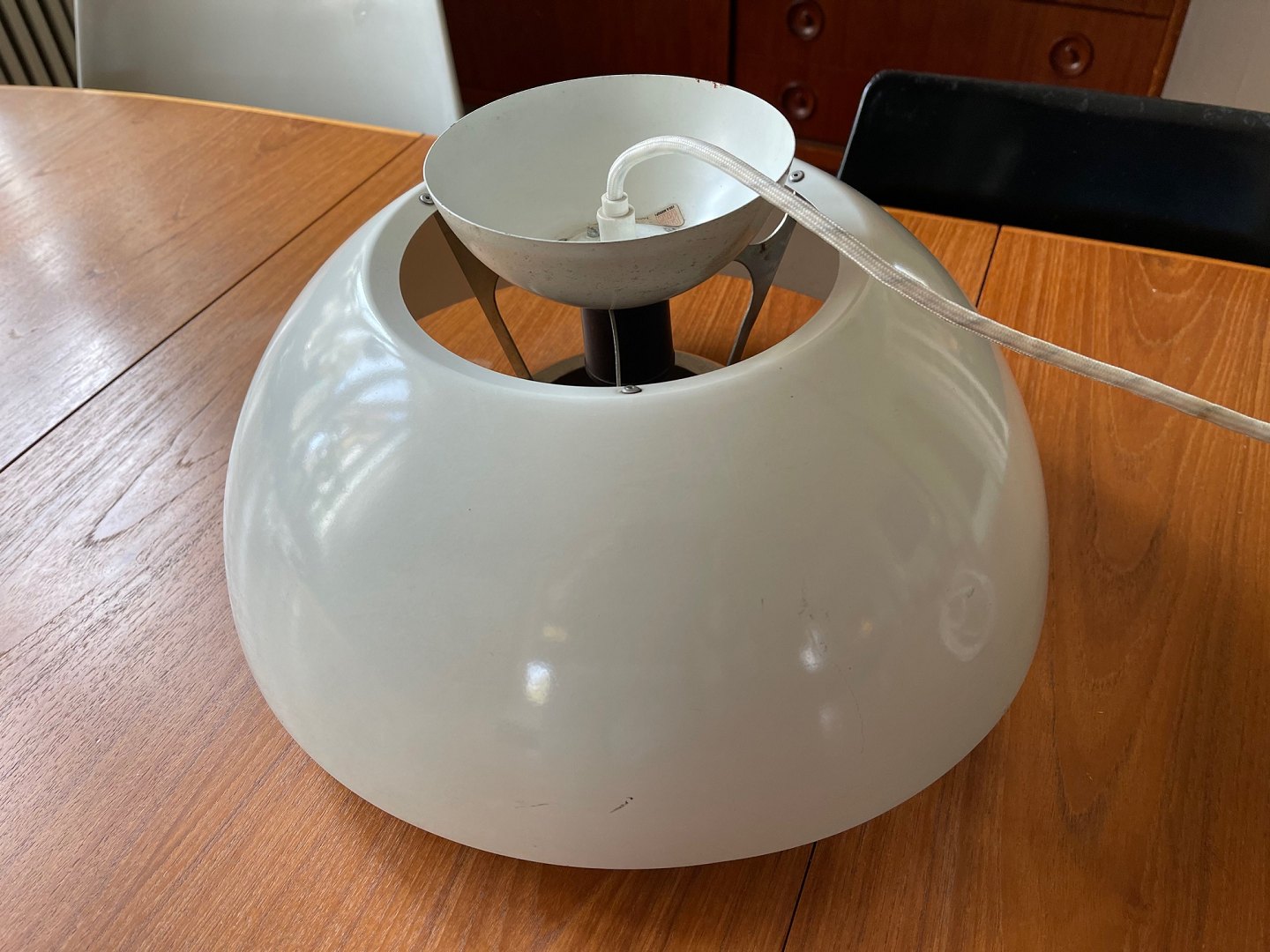 Denne lampe Legato fra Fog & Mørup ses ikke så ofte. Den er designet af Jo Hammerborg og lanceret i 1974. Dette eksemplar har en del patina i form af rustpletter, som dog ikke skaller.