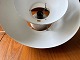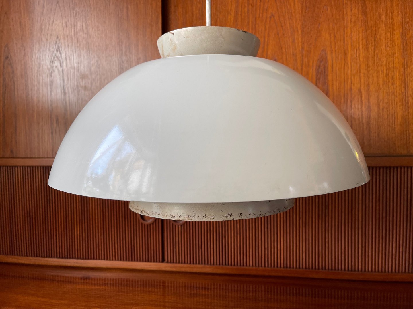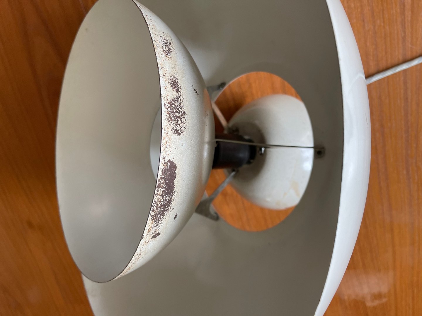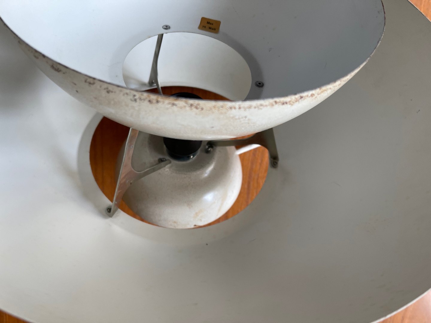 Denne lampe Legato fra Fog & Mørup ses ikke så ofte. Den er designet af Jo Hammerborg og lanceret i 1974. Dette eksemplar har en del patina i form af rustpletter, som dog ikke skaller.